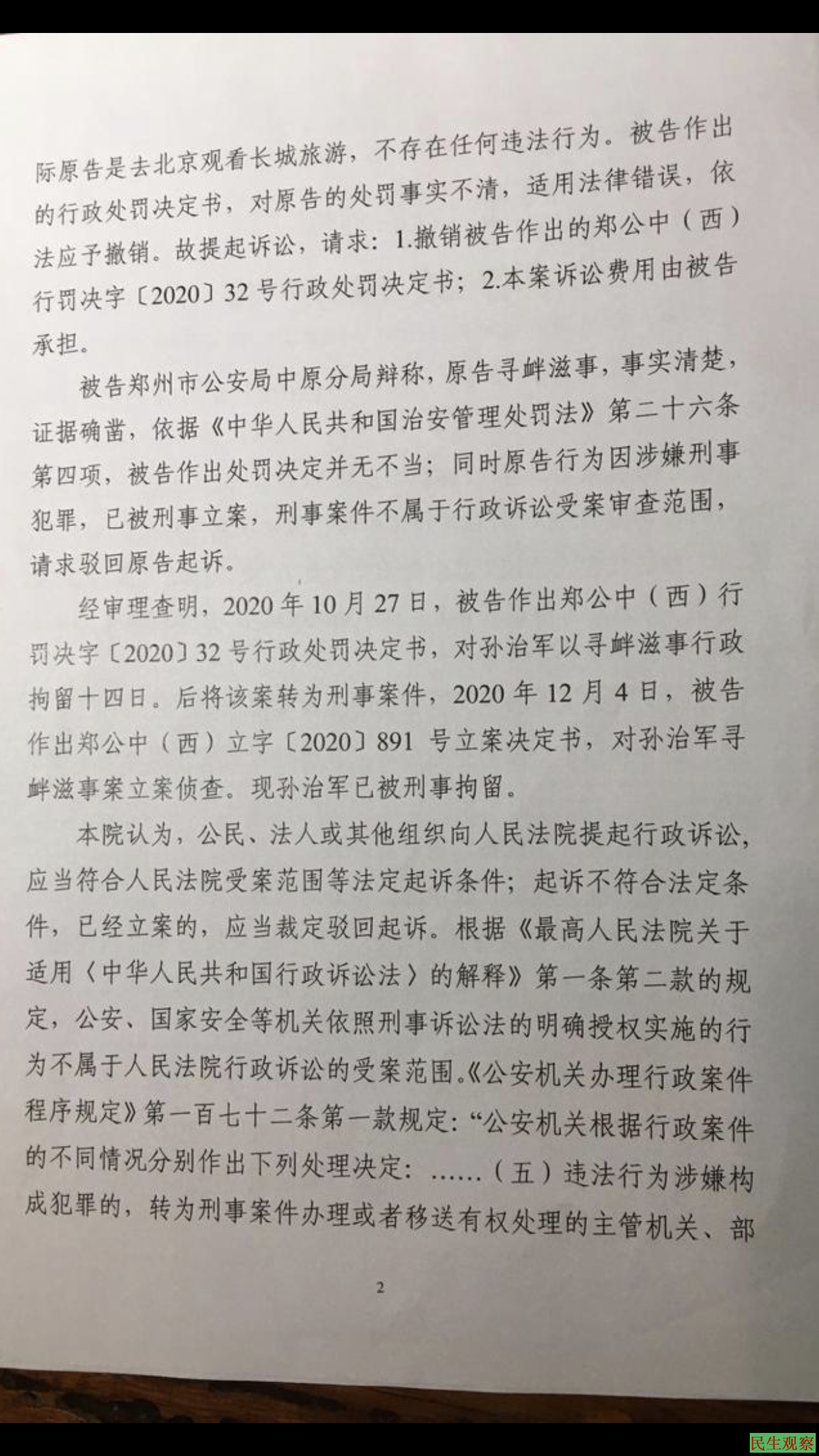 郑州铁路法院法院《裁定书》中称:现孙治军已被刑事拘留。本院认为,公⺠、法人或其他组织向人⺠法院提起行政诉讼,应当符合人⺠法院受案范围等法定起诉条件;起诉不符合法定条件,已经立案的,应当裁定驳回起诉。”......(五)违法行为涉嫌构成犯罪的,转为刑事案件办理或者移送有权处理的主管机关部门办理,无需撤销行政案件。公安机关已经作出行政处理决定的,应当附卷”。本案中,被告已将原告寻衅滋事案转为刑事案件办理,原告所诉的行政处罚决定已并入刑事案卷,被告正依照刑事诉讼法的明确授权实施刑事司法职能,故原告所诉不属于人⺠法院行政诉讼的受案范围。“为由,裁定“驳回原告孙治军的起诉。”