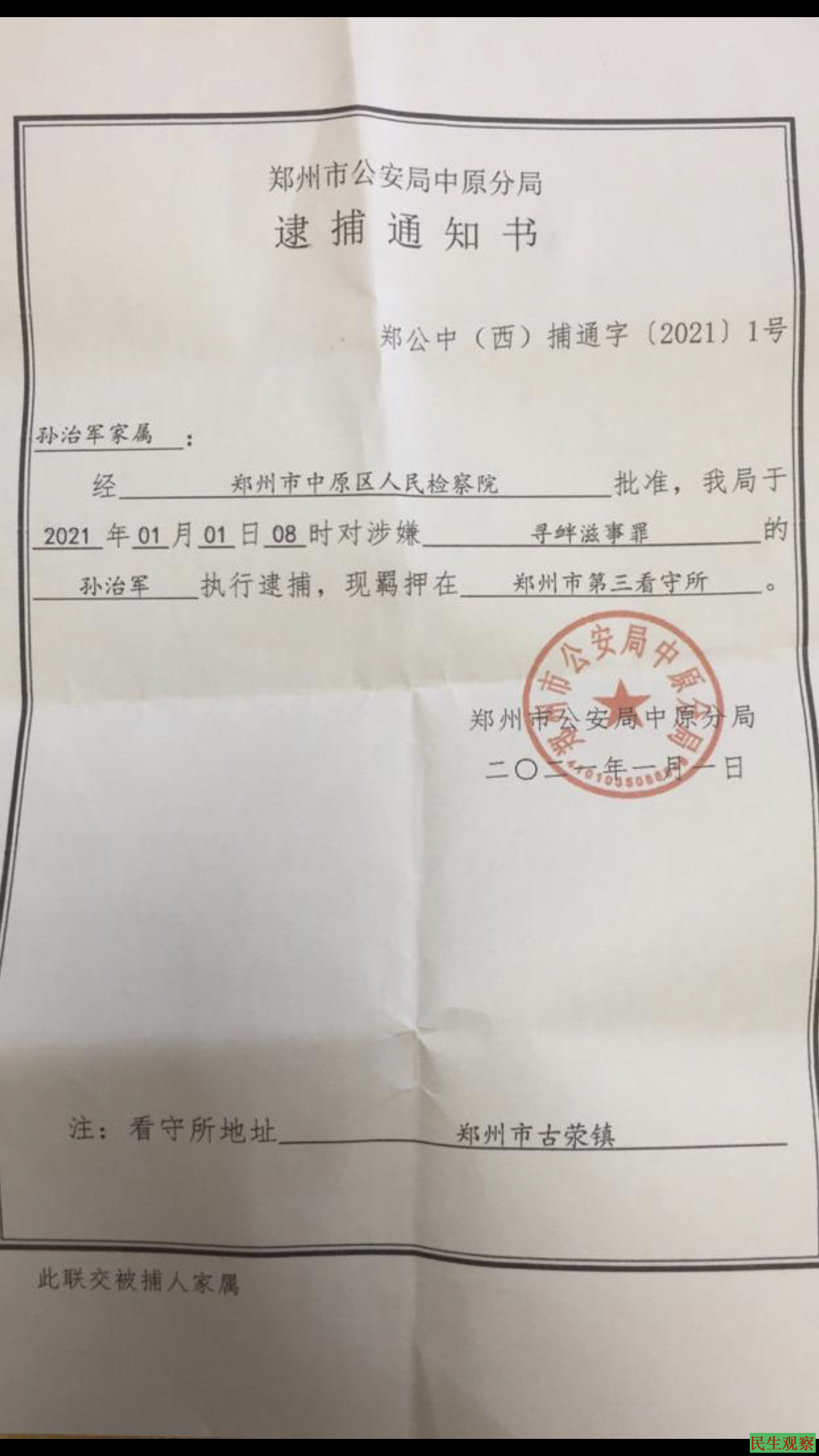 【民生观察2021年1月2日消息】本网获悉,被河南郑州市公安局中原分局以涉嫌“寻衅滋事罪”刑事拘留的郑州维权人士孙治军,1月1日被逮捕,家属收到《逮捕通知书》,被警方恐吓不许接受外媒采访。