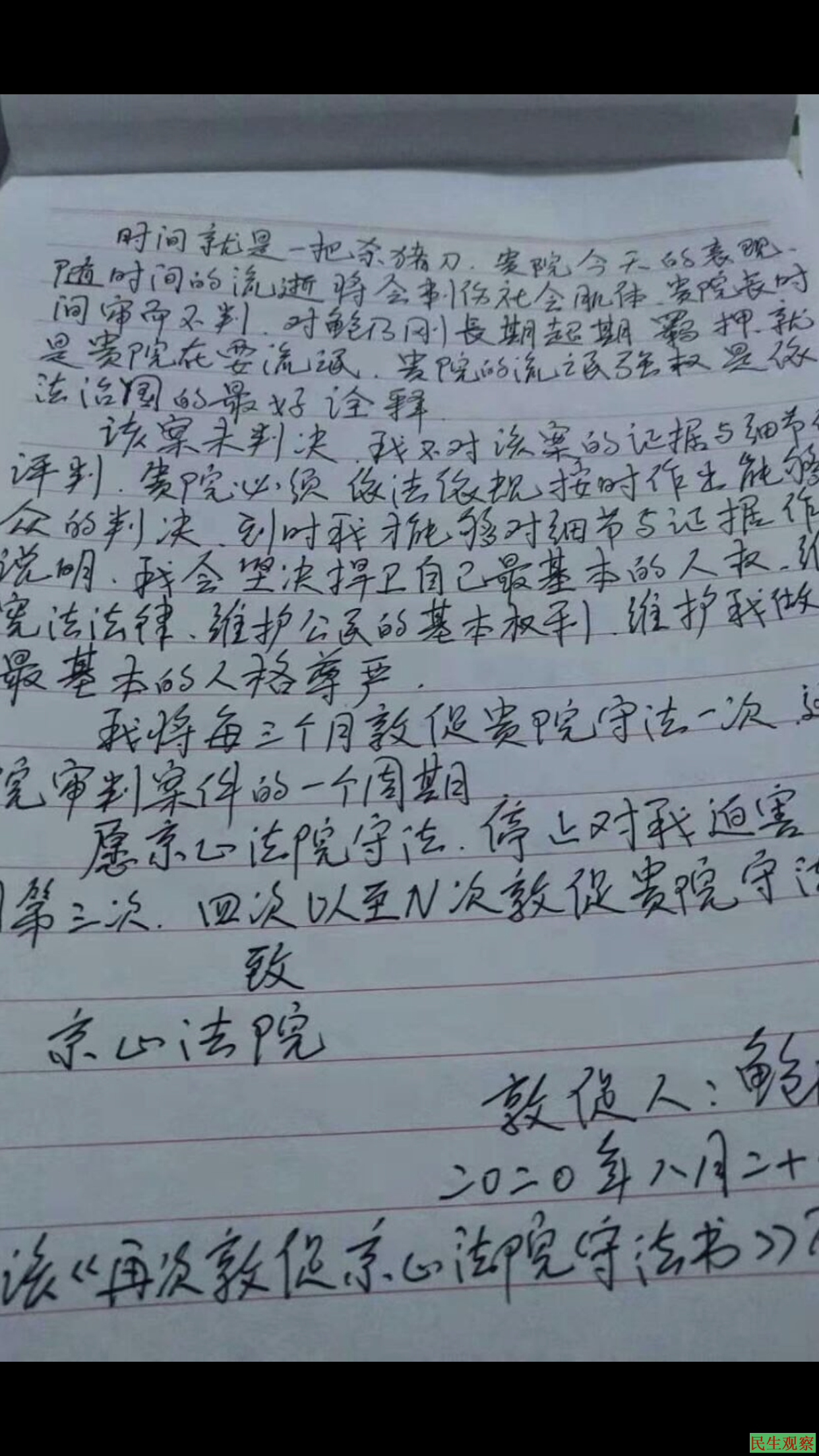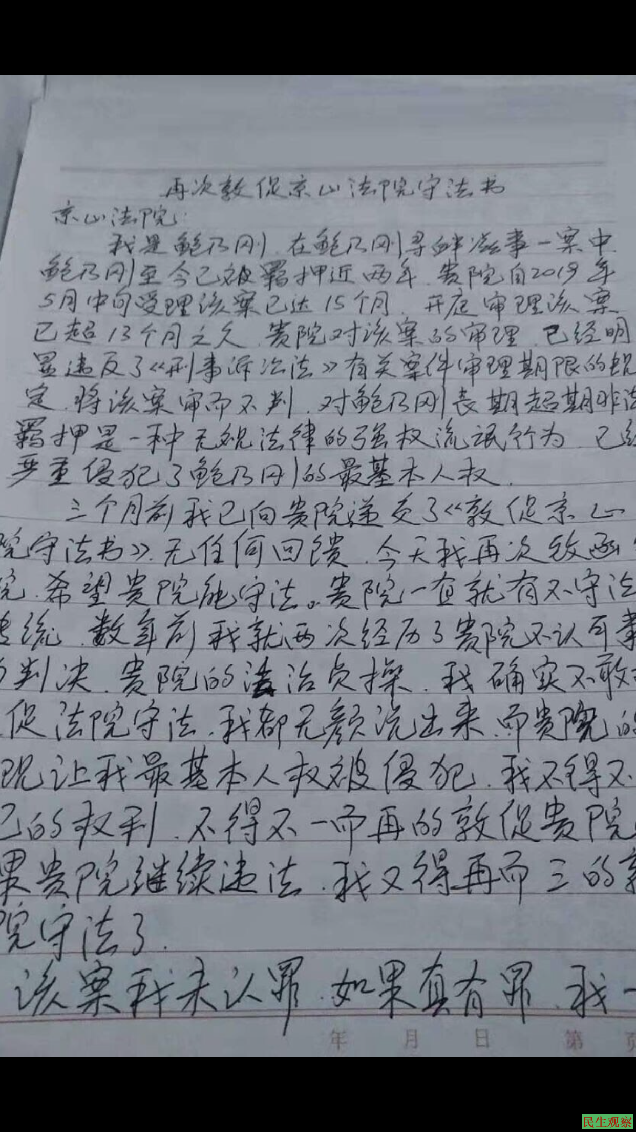 【民生观察2021年3月9日消息】卢京美律师于3月5日发布消息称,2021年3月5日上午9时许,我来到京山看守所会见鲍乃刚。会见中与鲍乃刚首先表达了对京山法院作出一审判决书的严重不服,并在法院送达文书时明确表示上诉。上诉期间鲍乃刚亲笔手写36页上诉状详尽阐述了一审法院程序上违法和实体上认定其行为构成寻衅滋事罪的错误之处并交由派出所转交一审法院。本人于2021年2月8日为鲍乃刚撰写了一份上诉状并于当日由京山看守所转交鲍乃刚签字后邮寄给荆门市中级法院。
