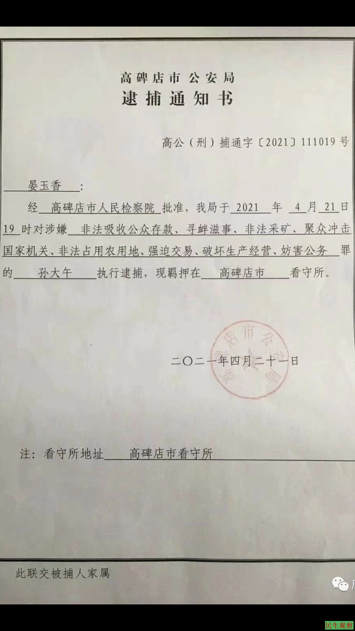 2021年4月21日晚上,河北孙大午案被指定居所监视居住的7位当事人家属分别收到公安送达的逮捕通知书。他们是: