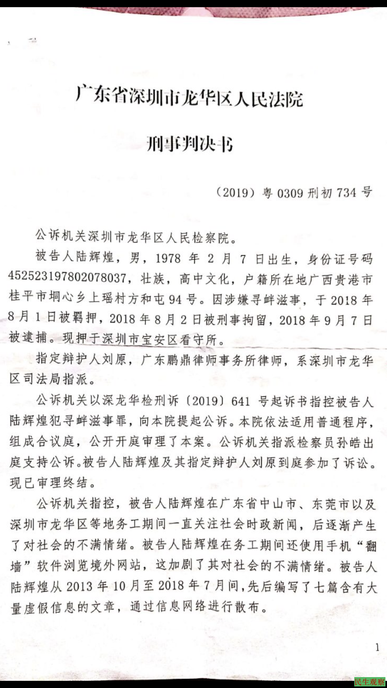 【民生观察2021年6月29日消息】广西陆辉煌,2018年8月2日因涉嫌寻衅滋事被深圳市公安局龙华分局刑事拘留,同年9月7日被逮捕。2020年4月26日,深圳市龙华区人民法院以寻衅滋事罪判处有期徒刑二年六个月。2020年5月28日被押往从化监狱执行,于2021年1月31日刑满释放。判决书如下: