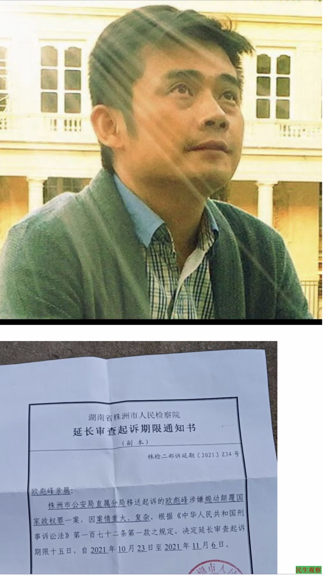 【民生观察2021年10月27日消息】本网获悉,湖南株洲异议人士欧彪峰涉嫌煽动颠覆国家政权罪一案,目前被株洲市人民检察院延长审查起诉期限。