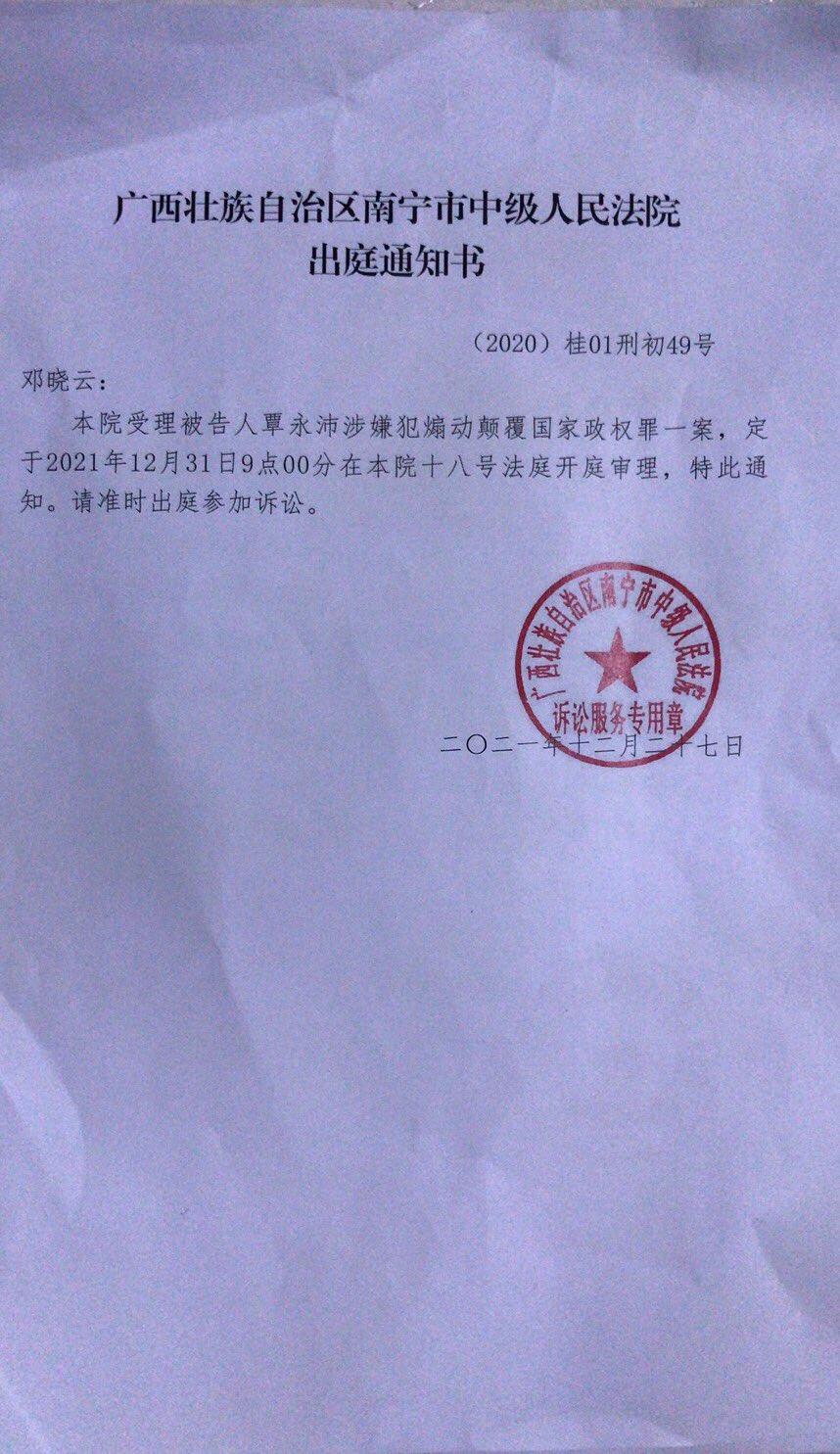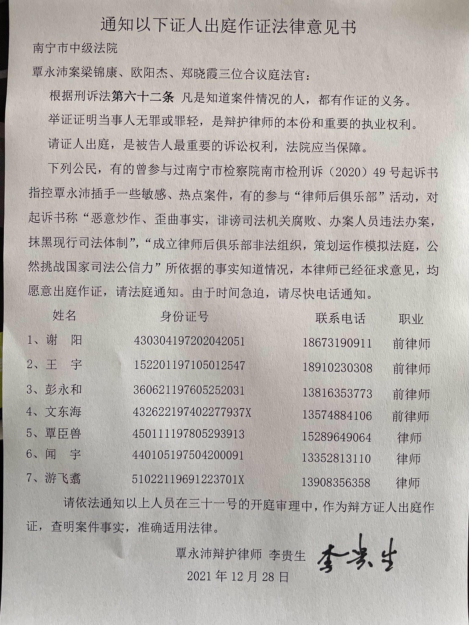 【民生观察2021年12月29日消息】广西前人权律师覃永沛涉嫌煽动颠覆国家政权罪一案,将于2021年12月31日在广西壮族自治区南宁市中级人民法院十八号法庭开庭审理。12月27日在看守所召开了庭前会议,今天辩护律师李贵生向法官提交了《通知以下证人出庭作证法律意见书》,法官答复基本不同意证人出庭,并不允许律师自带电脑开庭,由法院提供电脑。据悉,该案一审在南宁市中院不公开审理,女儿亲人朋友都不得旁听,覃永沛妻子邓晓云发文抗议。