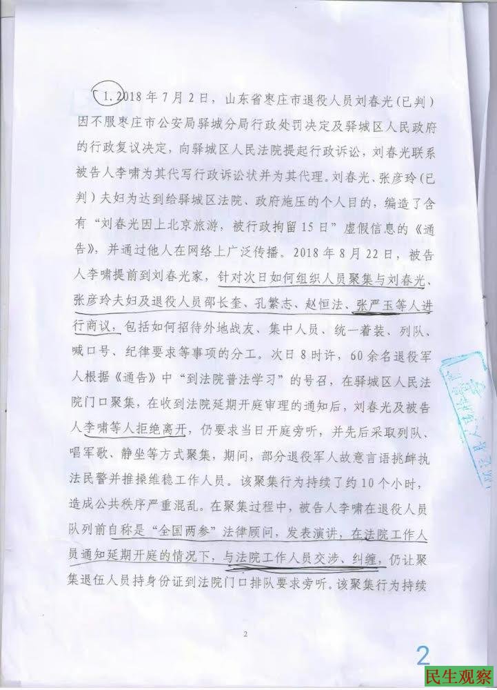 因不服枣庄市公安局驿城分局行政处罚决定及驿城区人民政府的行政复议决定,向驿城区人民法院提起行政诉讼,刘春光联系被告人李啸为其代写行政诉讼状并为其代理。刘春光、张彦玲(已判)夫妇为达到给驿城区法院、政府施压的个人目的,编造了含有“刘春光因上北京旅游,被行政拘留15日”虚假信息的《通告》,并通过他人在网络上广泛传播。2018年8月2日,被告人李啸提前到刘春光家,针对次日如何组织人员聚集与刘春光、张彦玲夫妇及退役人员邵长奎、孔繁志、赵恒法、张严玉等人进行商议,包括如何招待外地战友、集中人员、统一着装、列队、喊口号、纪律要求等事项的分工次日8时许,60余名退役军人根据《通告》中“到法院普法学习”的号召,在驿城区人民法院门口聚集,在收到法院延期开庭审理的通知后,刘春光及被告人李啸等人拒绝离开,仍要求当日开庭旁听,并先后采取列队、唱军歌、静坐等方式聚集,期间,部分退役军人故意言语挑衅执法民警并推搡维稳工作人员。该聚集行为持续了约10个小时,造成公共秩序严重混乱。在聚集过程中,被告人李啸在退役人员队列前自称是“全国两参”法律顾问,发表演讲,在法院工作人员通知延期开庭的情况下,与法院工作人员交涉、纠缠,仍让聚集退伍人员持身份证到法院门口排队要求旁听。该聚集行为持续约10个小时,造成交通拥堵,导致附近商户、居民经营及生活不便,造成公共秩序严重混乱。