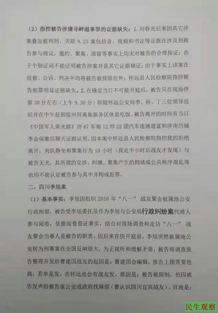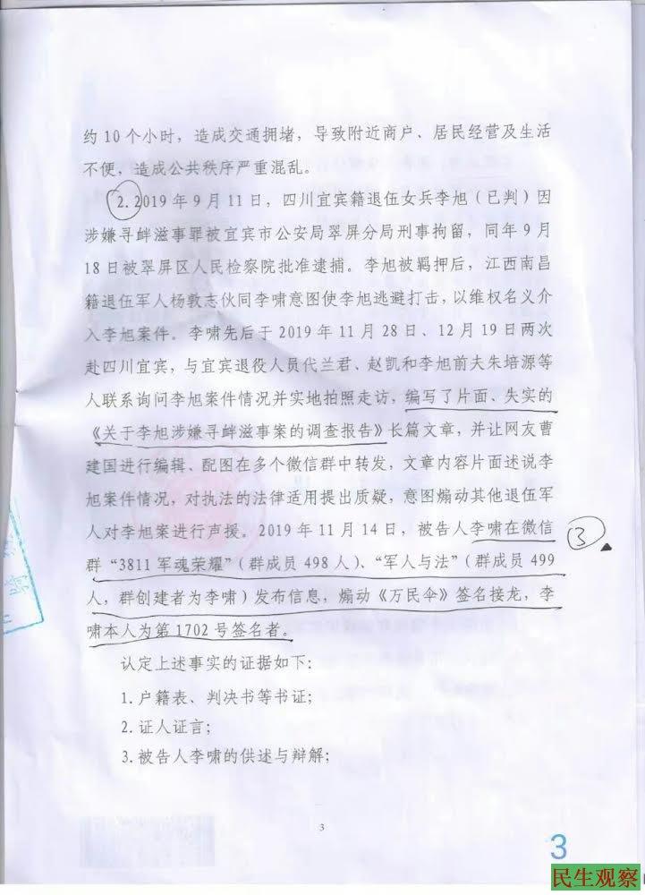2,2019年9月11日,四川宜宾籍退伍女兵李旭(已判)因涉嫌寻衅滋事罪被宜宾市公安局翠屏分局刑事拘留,同年9月18日被翠屏区人民检察院批准逮捕。李旭被羁押后,江西南昌籍退伍军人杨敦志伙同李啸意图使李旭逃避打击,以维权名义介入李旭案件。李啸先后于2019年11月28日、12月19日两次赴四川宜宾,与宜宾退役人员代兰君、赵凯和李旭前夫朱培源等人联系询问李旭案件情况并实地拍照走访,编写了片面、失实的《关于李旭涉嫌寻衅滋事案的调查报告》长篇文章,并让网友曹建国进行编辑、配图在多个微信群中转发,文章内容片面述说李旭案件情况,对执法的法律适用提出质疑,意图煽动其他退伍军人对李旭案进行声援。
