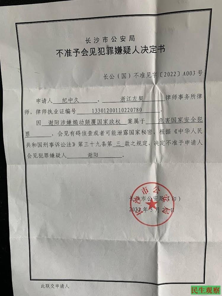 【民生观察2022年5月31日消息】湖南人权律师谢阳被以涉嫌煽动颠覆国家政权罪抓捕,至今已被非法羁押140天。近日,代理律师纪中久第三次要求会见谢阳被拒。