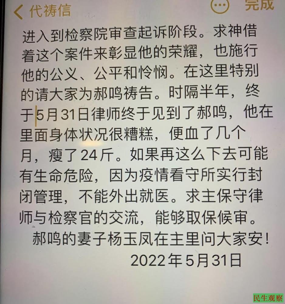 时隔半年,律师终于在5月31日见到了郝鸣长老。郝长老的案子已进入检察院审查起诉阶段。他身体状况很糟糕,便血了几个月,瘦了24斤,如果再这么下去恐有生命危险。因疫情看守所实行封闭管理,不能外出就医。郝鸣长老的妻子杨玉凤请大家为郝鸣长老祷告。求主保守律师与检察官的交流,能够取保候审。