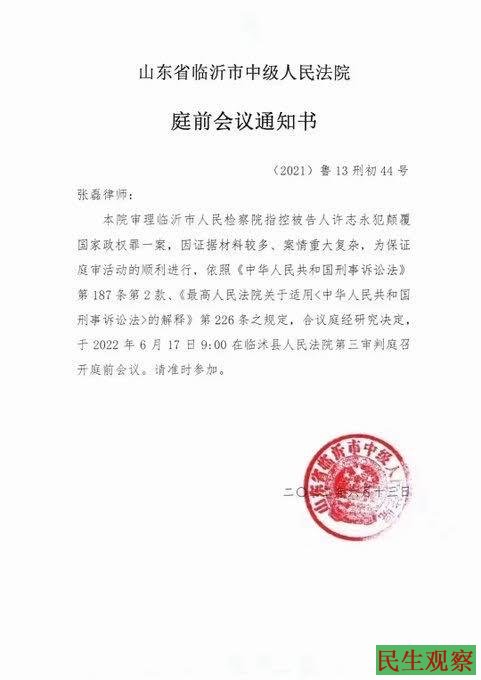 近日,许志永、丁家喜的辩护律师张磊、彭剑,分别收到山东省临沂市中级人民法院的庭前会议通知书,许志永、丁家喜犯颠覆国家政权罪一案,因证据材料较多,案情重大复杂,为保证庭审活动的顺利进行,经合议庭研究决定,将分别于6月17日、20日在临沭县人民法院第三审判庭召开庭前会议。