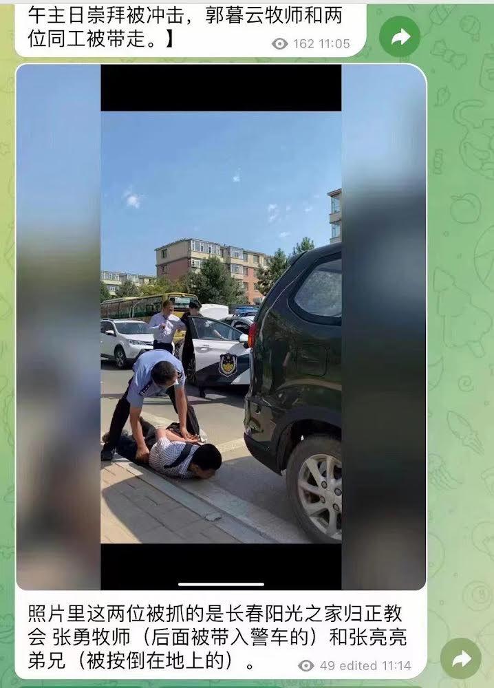 8月21日上午,吉林省长春市阳光归正教会,被当地警察冲入聚会场所,强行驱散,并带走张勇牧师、曲洪亮长老和信徒张亮亮。中间警察暴力执法,其中两位女信徒突发心脏病,打了120送医院救治。