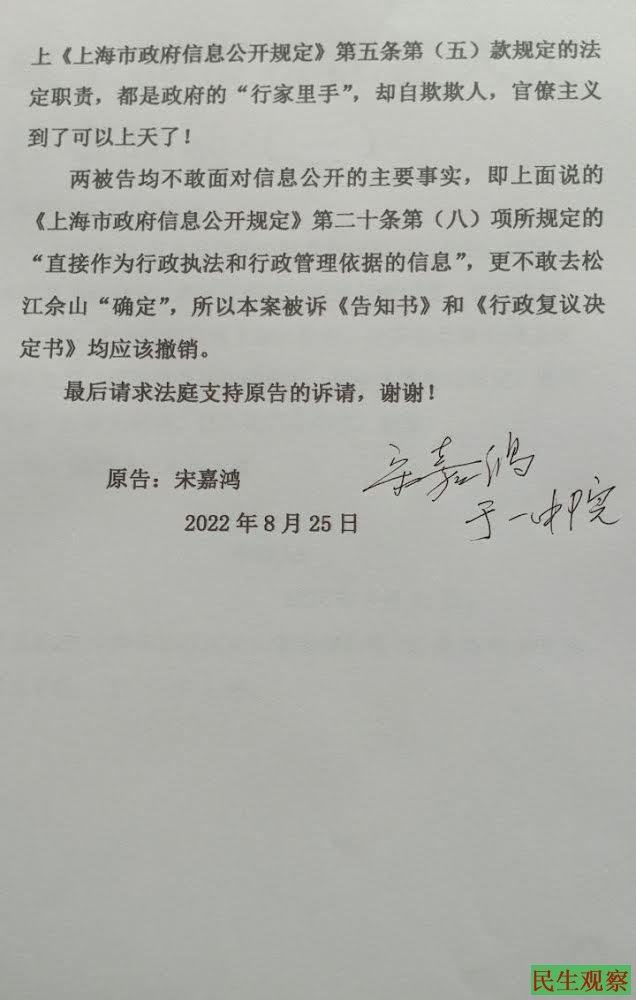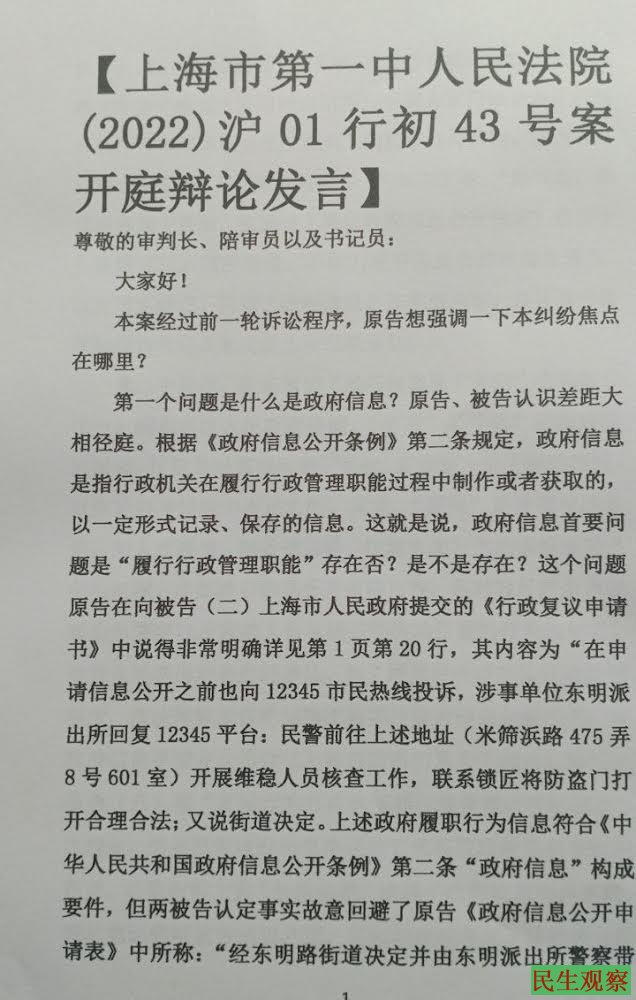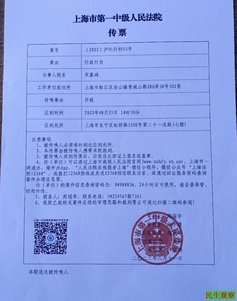 【民生观察2022年8月29日消息】2022年8月25日,作为原告的上海黄浦区拆迁户访民宋嘉鸿,诉上海市浦东新区人民政府、上海市人民政府一案,在上海市第一中级人民法院第二十一审判庭开庭审理。