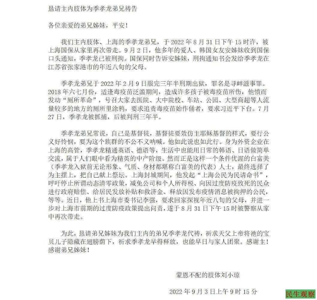 近日,季孝龙致信上海市委书记李强,要求回家探视年近八旬的父母,并进一步对上海市前期的过度防疫政策提出问责,遂于8月31日下午15时被警察从家中再次带走。