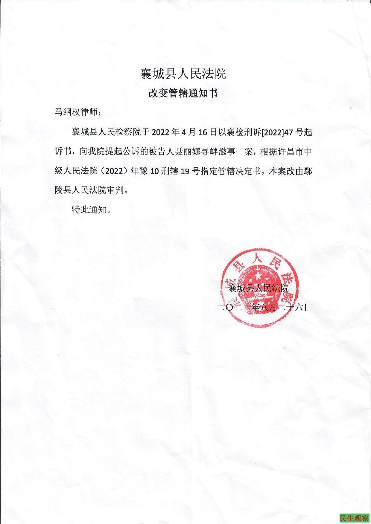 【民生观察2022年9月5日消息】2022年8月26日,河南省襄城县法院通知聂丽娜的律师:聂丽娜被“寻衅滋事”一案,变更法院管辖,改由鄢陵县法院审判。此前,在审查起诉期间,因案发地在北京国家信访局、且案件存在严重的地方干预,律师曾向襄城县检察院提出书面建议,要求将案件移送北京市西城区检察院管辖,但被拒绝。襄城县法院立案后,律师又继续向襄城县法院提出管辖权异议,要求将案件移送北京市西城区法院管辖或者报请上级人民法院处理。经研究后,襄城县法院将该案上报许昌市中院,中院最终决定变更法院管辖。