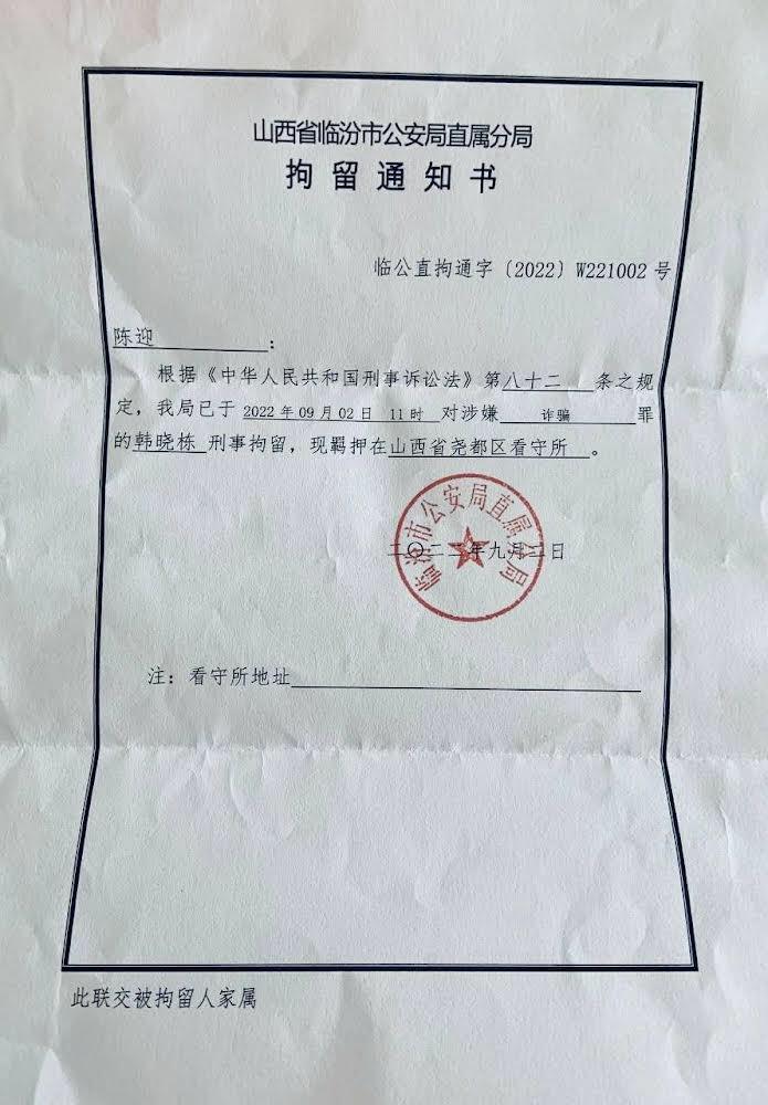 2022年8月22日,教会李洁传道、李姗姗姐妹(李洁的妻子)、韩晓栋传道,被临汾市公安局直属分局以涉嫌“诈骗罪”,执行指定居所监视居住。家属于2022年8月23日收到书面通知书。