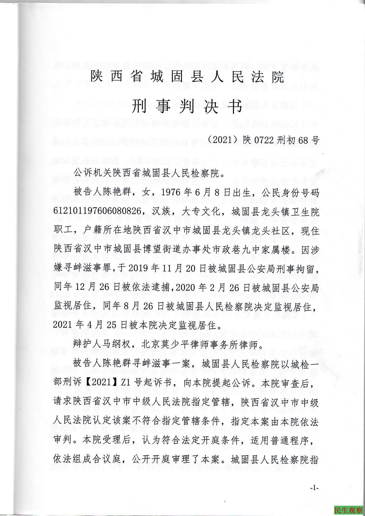 【民生观察2022年9月24日消息】2022年9月9日上午,城固县法院在该院科技法庭宣判陈艳群涉嫌寻衅滋事一案,判处陈艳群犯寻衅滋事罪,免予刑事处罚(附后)。宣判后,陈艳群对该判决不服,坚持认为自己无罪,于2022年9月19日向汉中市中院提起上诉。