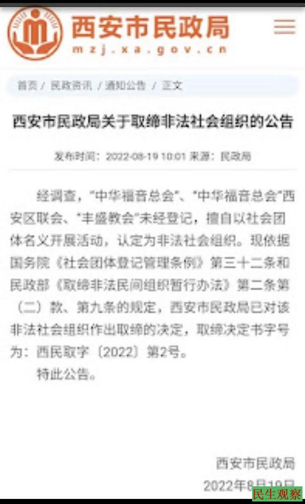2022年8月19日,西安丰盛教会被中共当局正式取缔,西安市民政局发布了取缔公告,公告称:经调查,“中华福音总会”、“中华福音总会”西安区联会、“丰盛教会”未经登记,擅自以社会团体名义开展活动,认定为非法社会组织,现依法取缔。