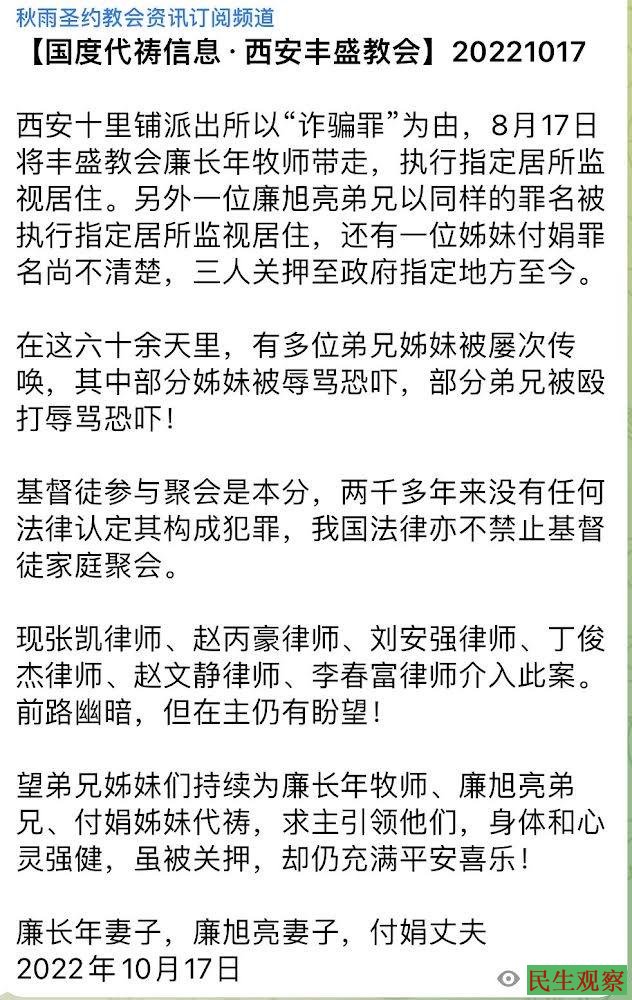 2022年10月17日,廉长年妻子,廉旭亮妻子,付娟丈夫发出代祷信:西安十里铺派出所以“诈骗罪”为由,8月17日将丰盛教会廉长年牧师带走,执行指定居所监视居住。另外一位廉旭亮弟兄以同样的罪名被执行指定居所监视居住,还有一位姊妹付娟罪名尚不清楚,三人关押至政府指定地方至今。