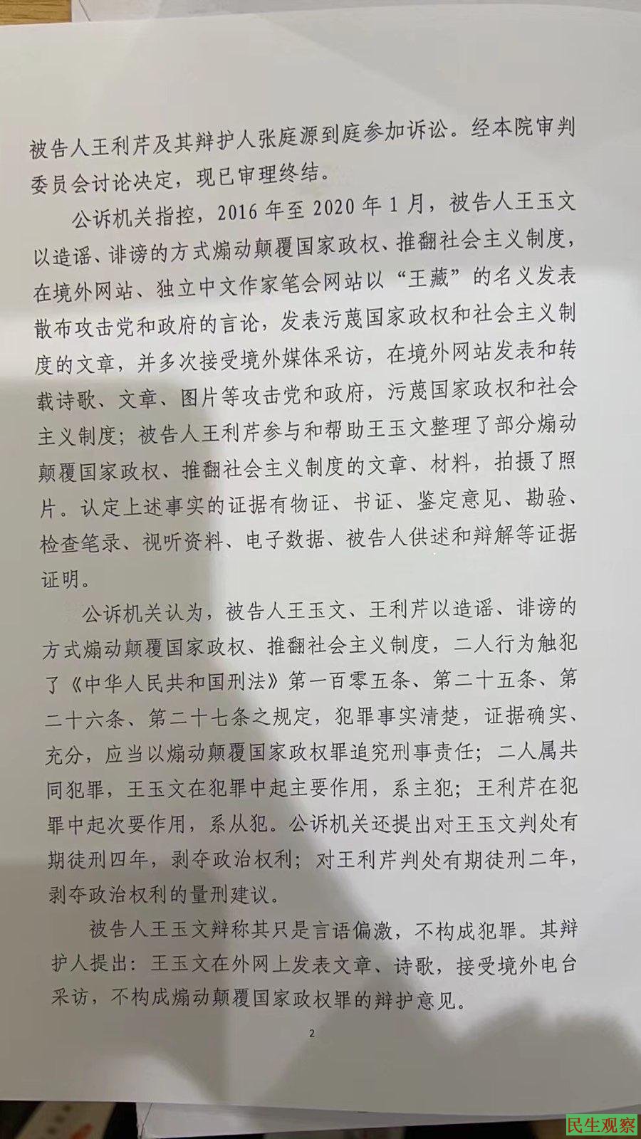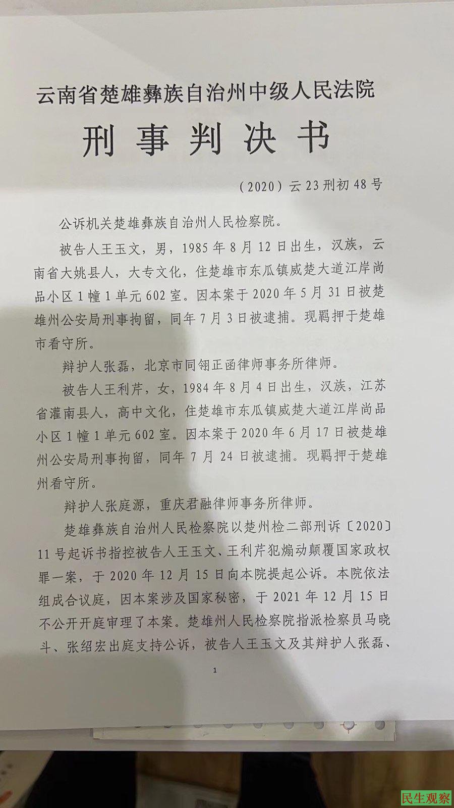 王玉文、王利芹煽动颠覆国家政权罪一案于2020年12月15日提起公诉。于2021年12月15日不公开开庭审理。