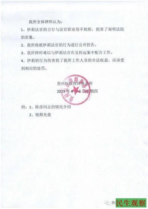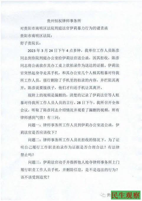 【民生观察2023年4月9日消息】2023年3月24日,贵州恒权律师事务所陈彦女士到贵阳市南明区法院刑庭伊莉法官处联系接洽工作,受到伊莉法官等人粗暴对待。近日,贵州恒权律师事务所就贵阳市南明区法院刑庭法官伊莉的暴力行为,向南明区法院送达了《谴责函》,亦同时向属地管辖公安机关进行了书面报案。