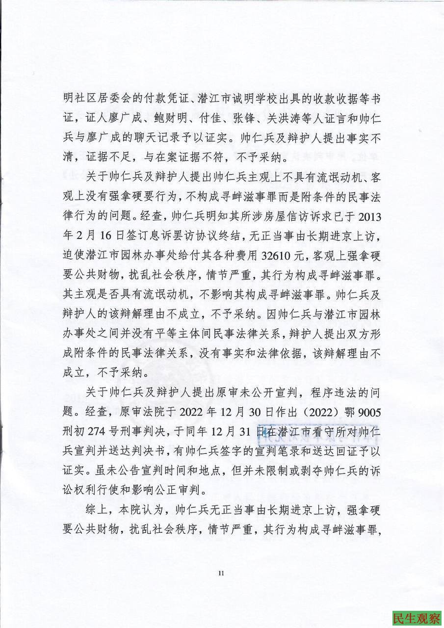 【民生观察2023年5月12日消息】湖北省仙桃市汉江中级人民法院在2023年3月29日不开庭秘密进行宣判,并且没有辩护律师到庭,剥夺了在押人员的正当辩护权,帅仁兵寻衅滋事罪二审维持原判三年六个月。