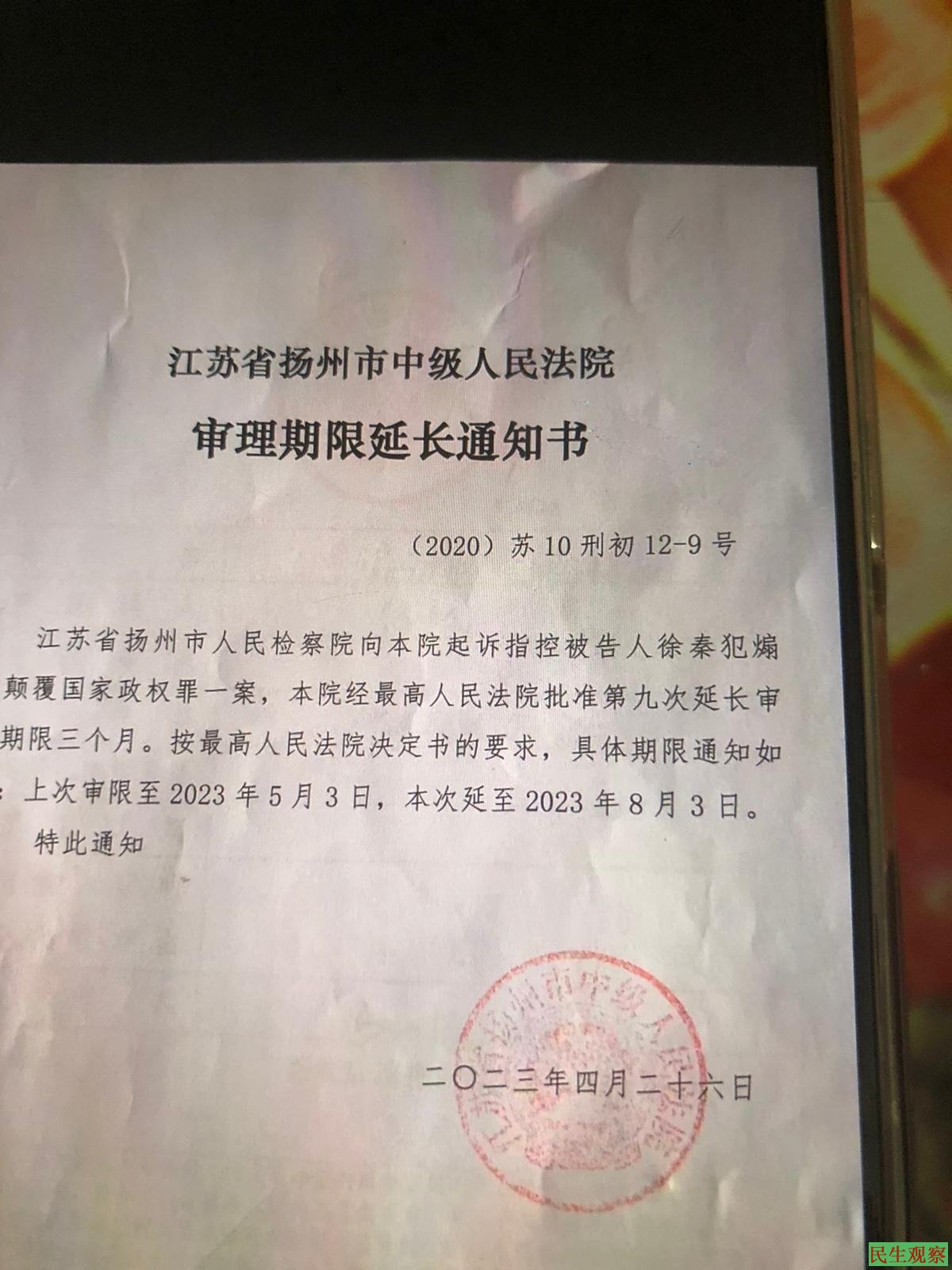 江苏省扬州市人民检察院向本院起诉指控被告人徐秦犯煽颠覆国家政权罪一案,本院经最高人民法院批准第九次延长审期限三个月。按最高人民法院决定书的要求,具体期限通知如上次审限至2023年5月3日,本次延至2023年8月3日。特此通知