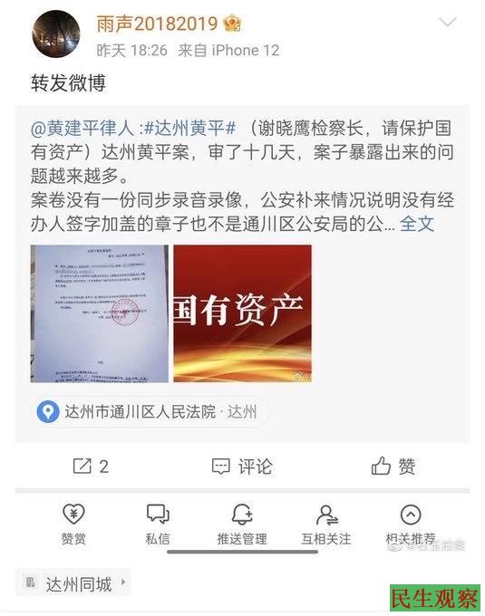 2023年6月15日,雨声在其微博转发谢晓鹰检查长,请保护国有资产,达州黄平案,审了十几天,案子暴露出来的问题越来越多的文章。