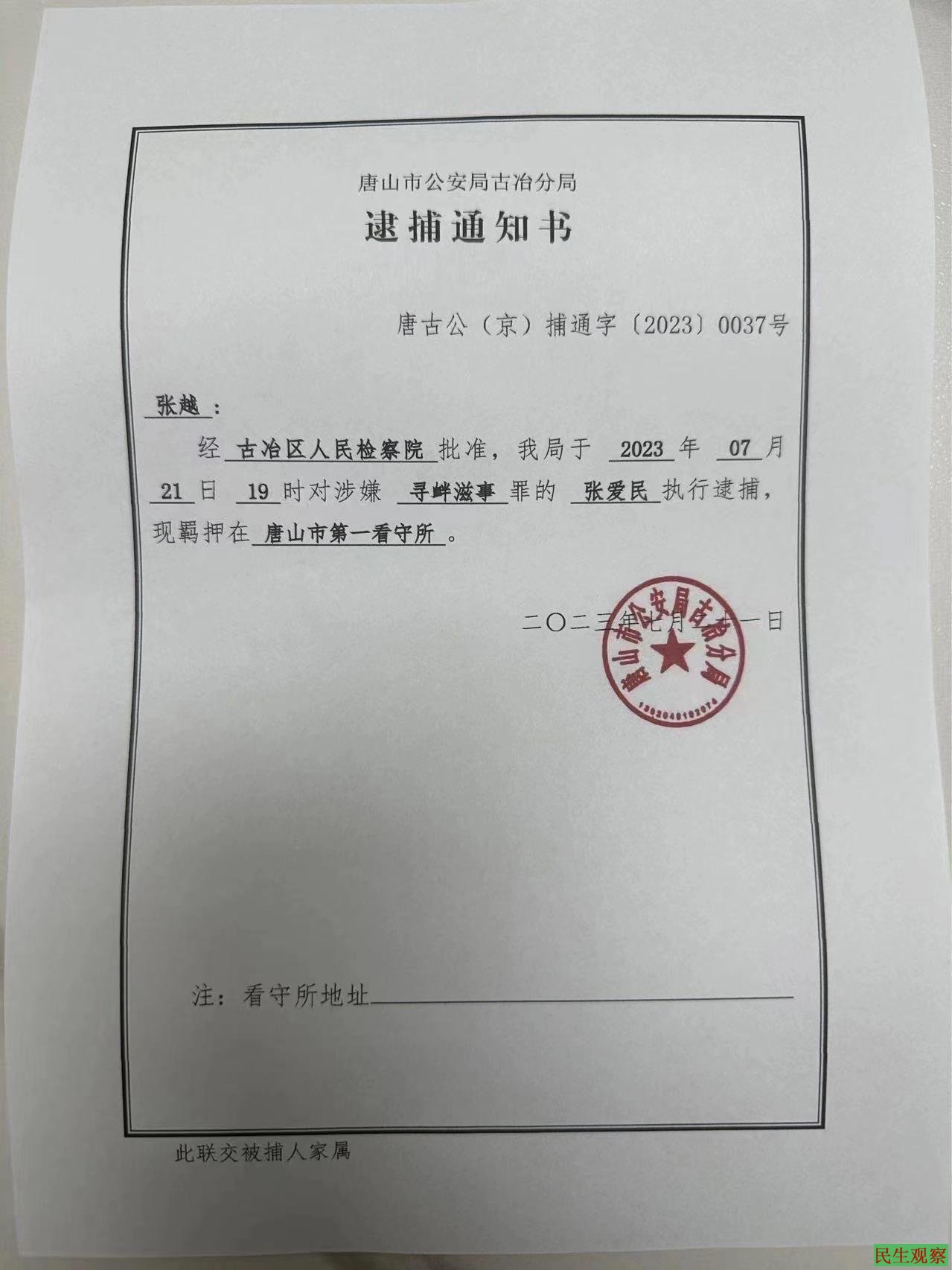 6月15日上午,张爱民到国家信访局反映京华办事处工作人员有失人道救援的行为,不料,却被拦截在信访局入口处,随后被移交给唐山市古冶区京华派出所。当天,张爱民被遣返回当地,并被以涉嫌寻衅滋事罪刑事拘留,羁押在唐山第一看守所。7月21日,张爱民被批准逮捕。仅仅三天之后,京华派出所就将案件快速移送至唐山市古冶区检察院审查起诉。