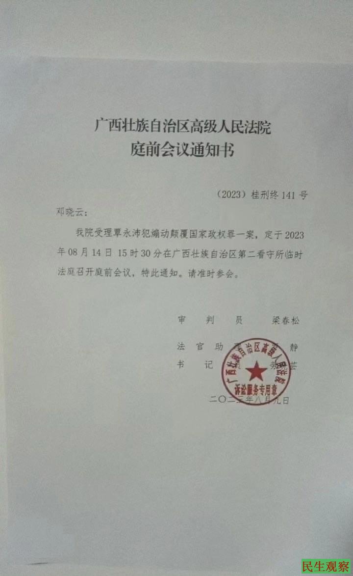 2023年8月9日,邓晓云收到广西壮族自治区高级人民法院的庭前会议通知书。