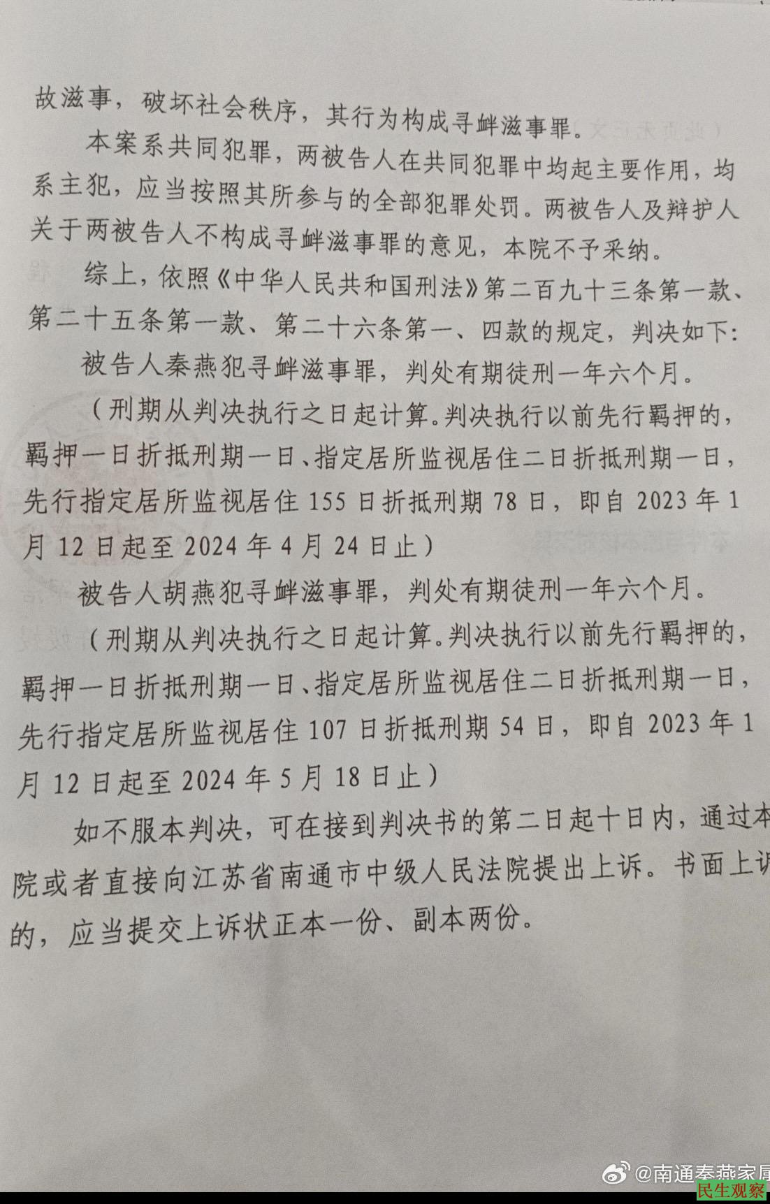 2023年11月1日也就是前天,是秦燕和弟媳胡燕俩因寻衅滋事罪二审在南通中院开庭的日子。
