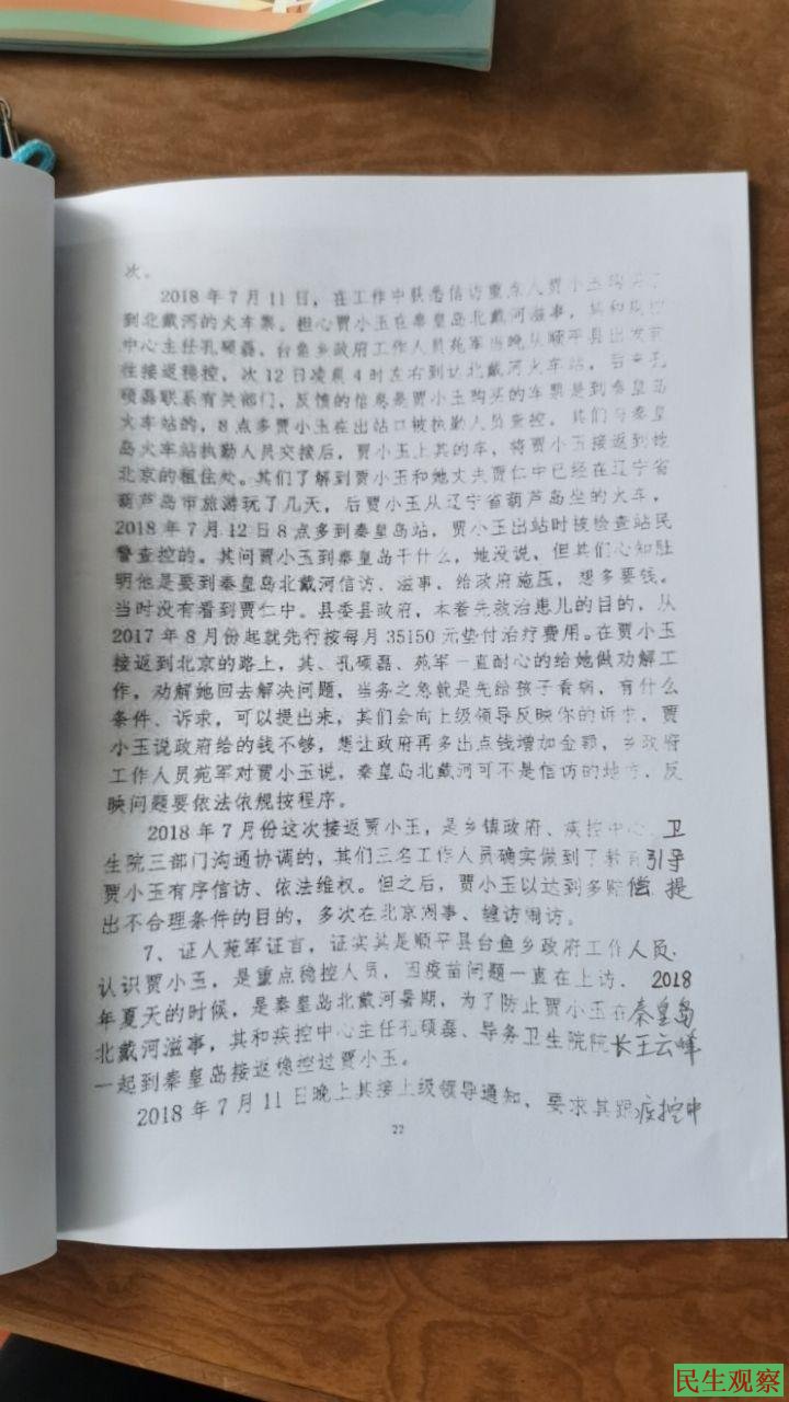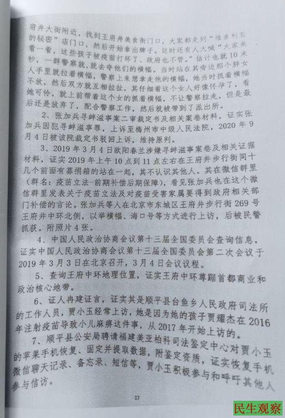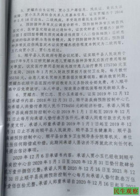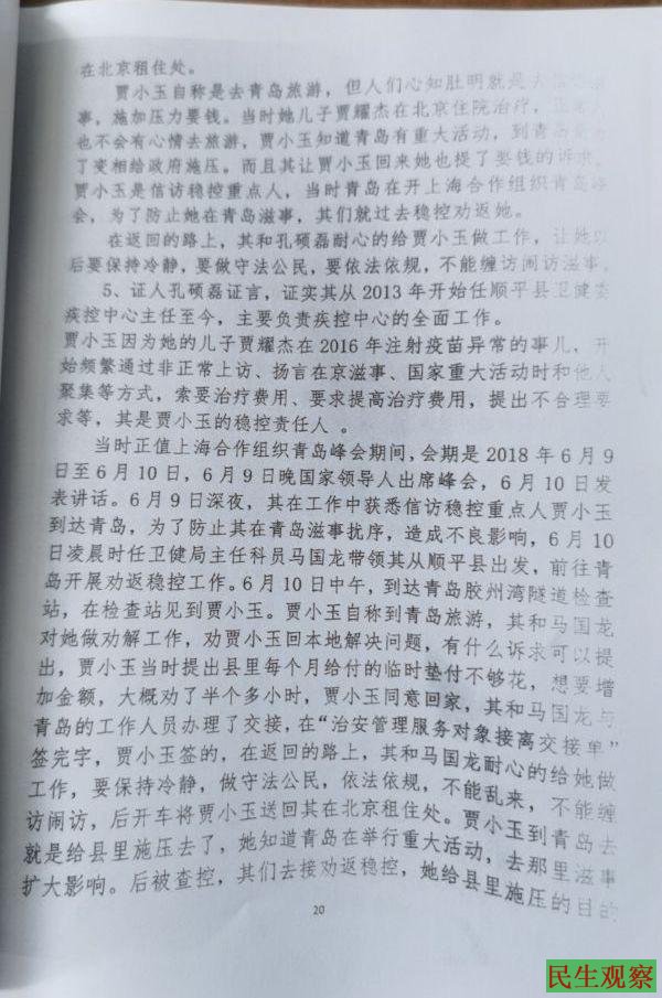 孩子事情一直没有进展,孩子也没有治疗费康复,看着可伶的孩子出生就被yi苗致残,父母心痛。2019年3.4日孩子妈妈贾小玉又到王府井大街拿着孩子的介绍喷绘布在那乞讨,过程也就10分钟不到被警察带走,警察说这地方是商业街不要在这地方乞讨,然后被顺平县疾控接回家。事情过后我们回到县里,等待县里给出解决办法,2019年3月15日,经过谈判,根据国家八部委《关于进一步做好预防接种异常反应处置工作的指导意见》(国卫疾控发【2014】19号)文件精神,我们签订了一个承诺书,县里每月支付孩子一定的治疗费(包括但不限于康复费治疗费,住宿费,生活费,营养费,路费等反正什么都在里面)。后来19,20,21年就这么一直维持看着病,孩子在不间断的康复下,认知等相关方面也有了很大的进步。在此期间,康复费已经涨了两次还是三次我忘了,医院有的项目都翻倍,医院大PT直接从150涨到300一个小时,住院押金也从3万调到5万一个月。22年4月中旬卫生局突然出了信访回复的一个含,没有法律依据继续垫付康复费,我们都很震惊,孩子正在向好的方面进步,我们微小的愿望就是儿子将来能够生活自理,这是一个父母多么绝望后的那么微小的奢望。后来经过争取又答应再给孩子看病,这样看病到22年的10月份正好北京开会(20大),他们要我们配合维稳回县里,这段时间不能在北京治疗,我们配合顺平县维稳人员回到县里,可我们回来3天把我们放宾馆看着,没有谈孩子事情,孩子妈妈和我生气就走了,去到隔壁县朋友家里住了几天,后来公安在宾馆审我三天,我说她生气走的,还骂了我,你们不谈,我也不知道去哪了。后来公安把她找到直接拘留15天,说是寻讯滋事,我不明白就去朋友家住了几天就犯罪了,没有任何理由。