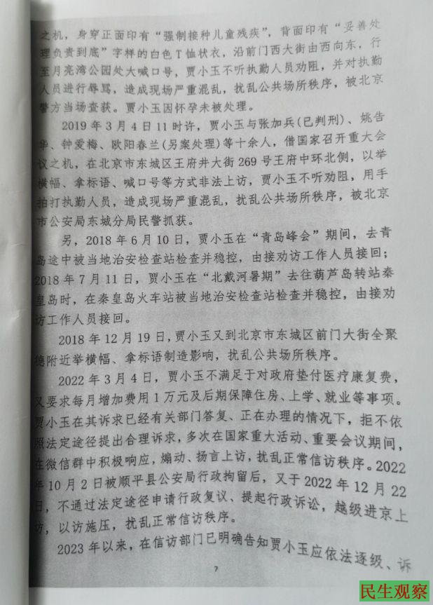 因注射疫苗造成孩子残障问题发生后,对孩子和家属的补偿问题迟迟得不到解决。贾小玉在2022年春节前后和其他疫苗受害者以及家属,继续去国家信访局信访。在2023年2月1日,信访后,被顺平县卫健公安信访相关人员暴力接访回保定顺平县。顺平公安2月2日以寻衅滋事罪开始行政拘留,到期又以寻衅滋事罪继续行政拘留,到期后不放人。于2023年3月12日以寻衅滋事罪转为刑事拘留,2023年3月25日批捕,同年11月27顺平法院以贾小玉犯寻衅滋事罪判决四年有期徒刑。指控主要犯罪理由是,5年前,前门月亮湾别墅门前的募捐、乞讨,抗议司法不公等活动。以及2019年3月4日王府井商业街募捐乞讨抗议活动,还有2022年的几次国家信访局的信访活动。