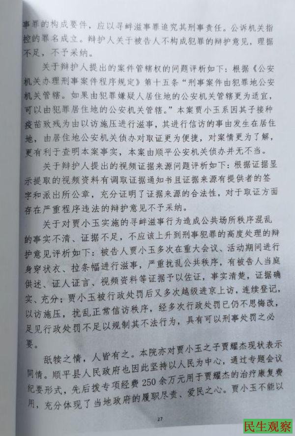 【民生观察2023年12月16日消息】2023年11月27日,疫苗受害者的母亲贾小玉,被判四年有期徒刑,罪名是寻衅滋事罪。