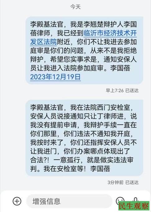 【民生观察2023年12月21日消息】2023年12月19日,李翘楚涉嫌煽动颠覆国家政权罪一案,在山东省临沂市经济技术开发区人民法院不公开审理,当庭未宣判。当日只有一名律师被允许进入法庭辩护,另一名律师李国蓓被拒绝进入。