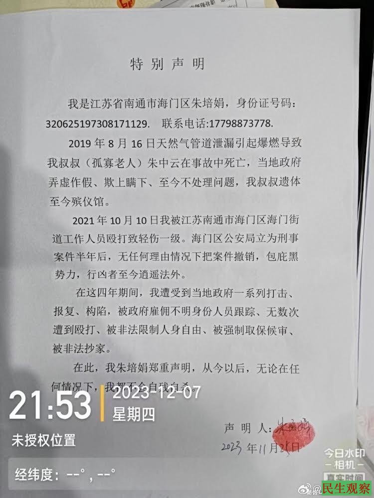 【民生观察2024年1月5日消息】江苏省南通市海门区朱培娟因上访维权被公安以寻衅滋事罪网上通缉,带回南通后被以寻衅滋事罪刑拘,家属称其遭到海门区公安局殴打,代理律师多次要求会见朱培娟被拒,丈夫许健在网上为其发声,昨日被警方以违反取保候审为由带走拘留。