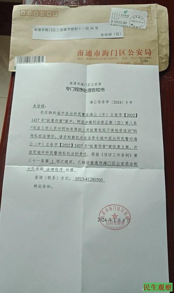 2024年1月5日,南通市海门区公安局向朱培娟出具了一份《专门程序处理告知书》。