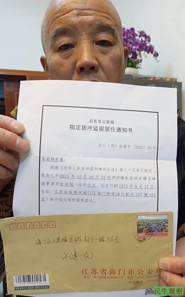 12月30日,许健接到启东市公安局发出的《指定居所监视居住通知书》。以“寻衅滋事”之名,朱培娟被指定居所监视居住。