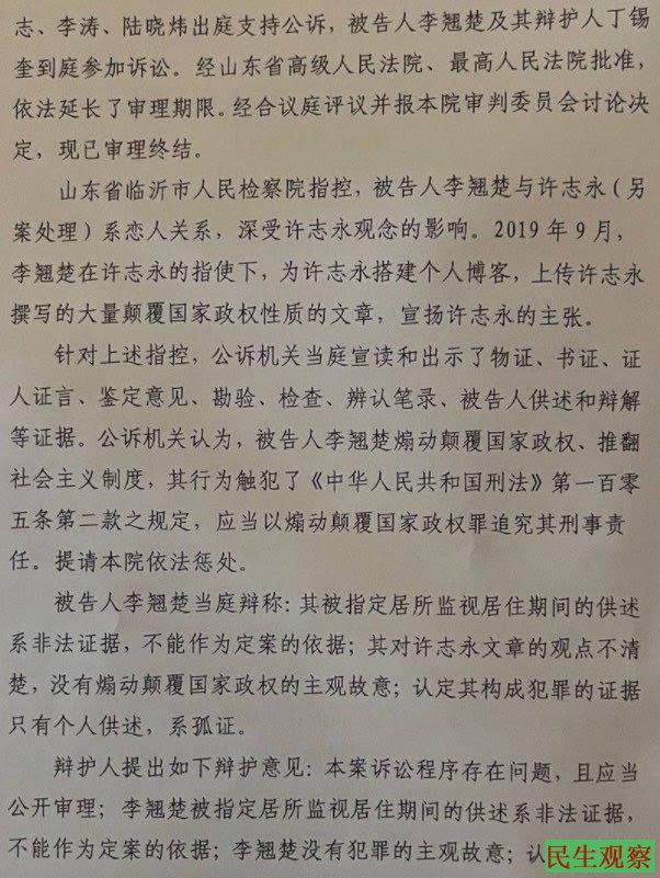 山东省临沂市人民检察院指控,被告人李翘楚与许志永(另案处理)系恋人关系,深受许志永观念的影响。