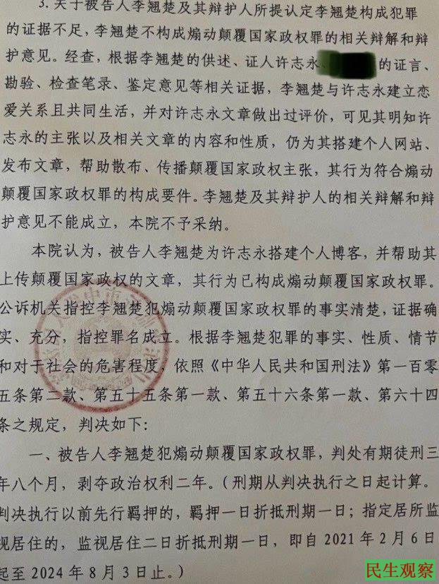 被告人李翘楚犯煽动颠覆国家政权罪,判处有期徒刑三年八个月,剥夺政治权利二年。刑期从判决执行之日起计算判决执行以前先行羁押的,羁押一日折抵刑期一日;指定居所监视居住的,监视居住二日折抵刑期一日,即自2021年2月6日至2024年8月3日止。