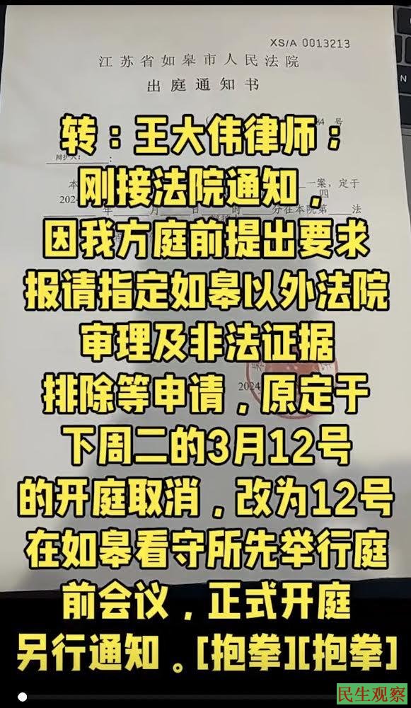 今天,张岳兵的代理律师接到法院通知:因我方庭前提出要求报请指定如皋以外法院审理及非法证据排除等申请,原定于下周二的3月12日的开庭取消,改为12号在如皋看守所先举行庭前会议,正式开庭另行通知。