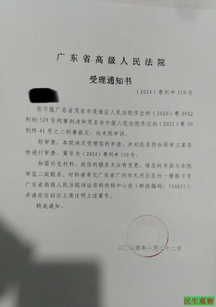 2024年1月1日,牛母收到了广东茂名法院邮寄的关于牛腾宇案维持原判决的通知书。牛母不服判决,随后向广东省高院提起申诉,继续为牛腾宇申冤。