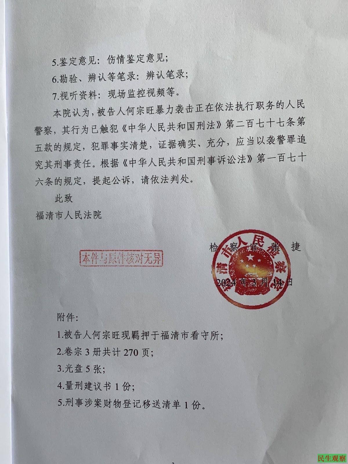 公诉机关福清检察院起诉何宗旺“袭警”,量刑建议是有期徒刑11个月。