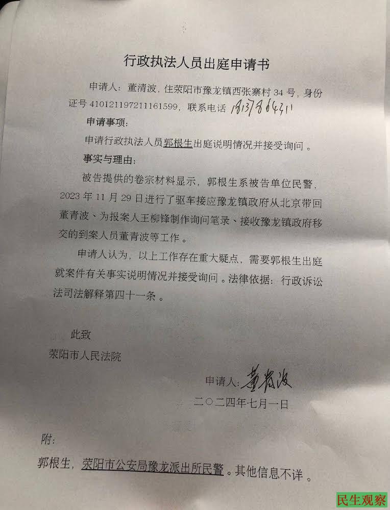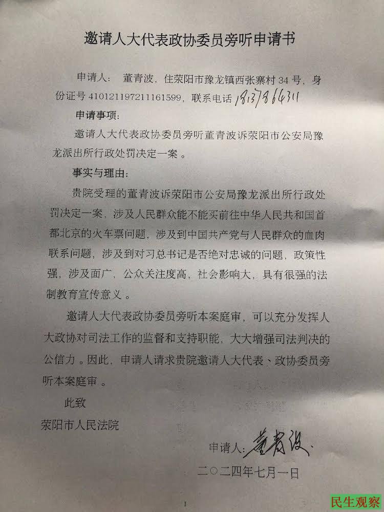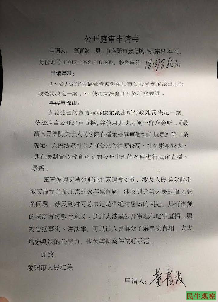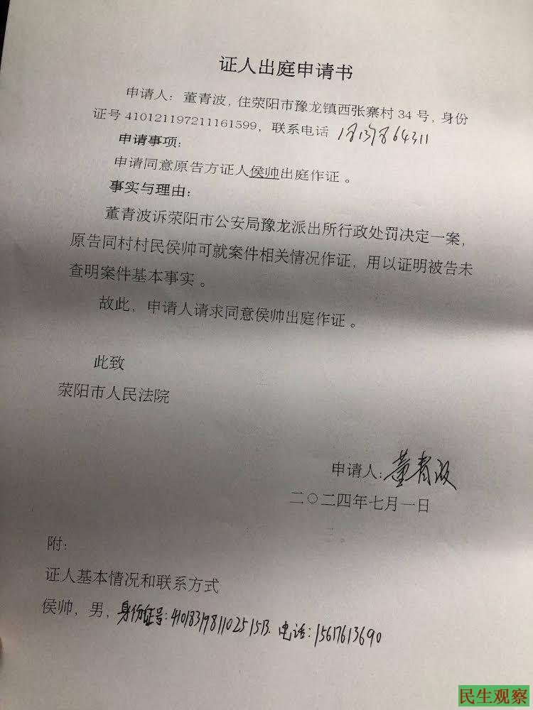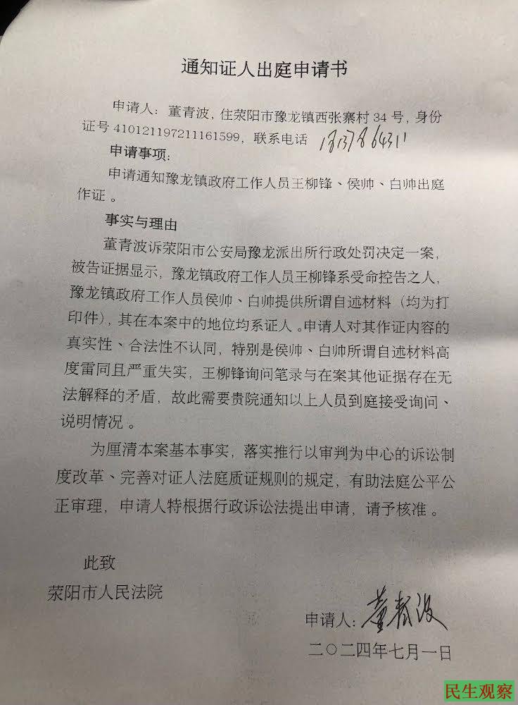 【民生观察2024年7月3日消息】本网获悉,河南省荥阳市豫龙镇西张寨村民董青波,诉荥阳市公安局豫龙派出所行政处罚决定一案,将于2024年7月5日在荥阳市人民法院开庭审理。7月1日,董青波向荥阳市人民法院递交了5份申请书,并要求该案公开庭审直播,使用大法庭便于群众旁听学法。