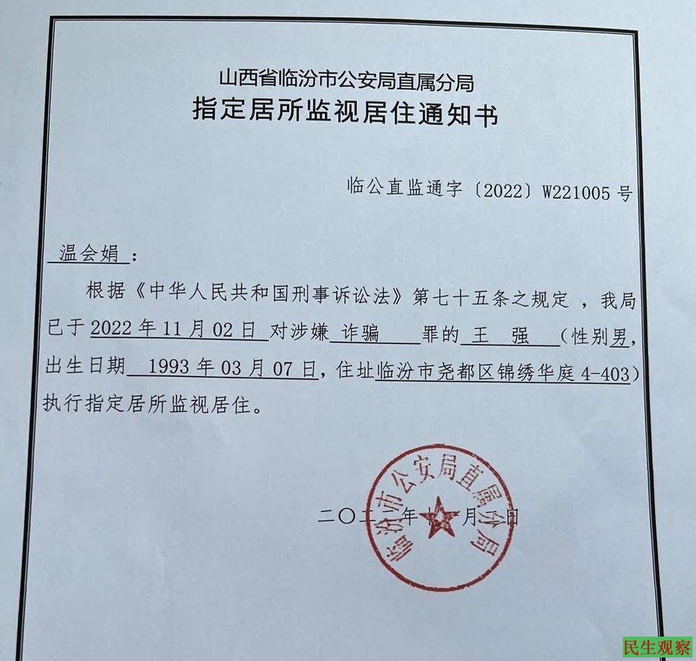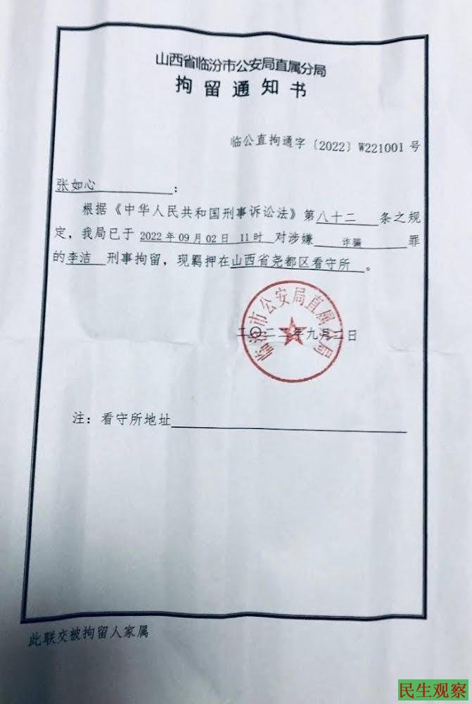2022年8月19日,李洁、韩晓栋在山西省晋中市石膏山景区被临汾市直属分局公安以违反治安管理为由抓走。2022年11月1日,王强在工作单位楼下又被直属分局公安秘密抓捕。他们现在都被关押在临汾市尧都区看守所。