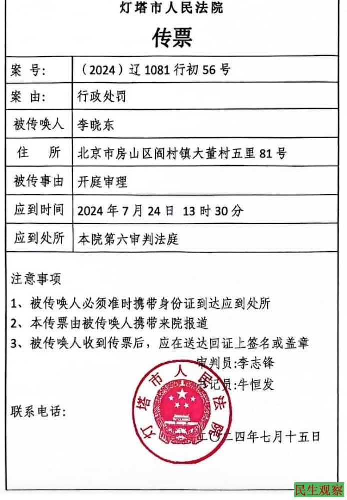 【民生观察2024年7月26日消息】李晓东家人收到辽宁灯塔市人民法院传票,(2024)辽1081行初56号,案由:行政处罚;被传唤人:李晓东;住所:北京市房山区阎村镇大董村五星81号。被传事由:开庭审理。应到时间:2024年7月24日,13时30分;应到处所:本院第六审判法庭。