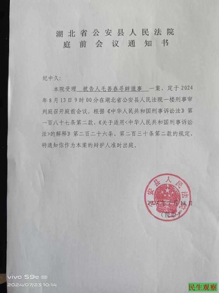【民生观察2024年7月27日消息】本网获悉,武汉维权人士毛善春涉嫌寻衅滋事一案,将于2024年8月13日在湖北省公安县法院召开庭前会议。其辩护人纪中久律师已经收到了书面通知书。2024年6月7日,该案被公安机关起诉至公安县人民检察院。其目前羁押于公安县看守所。