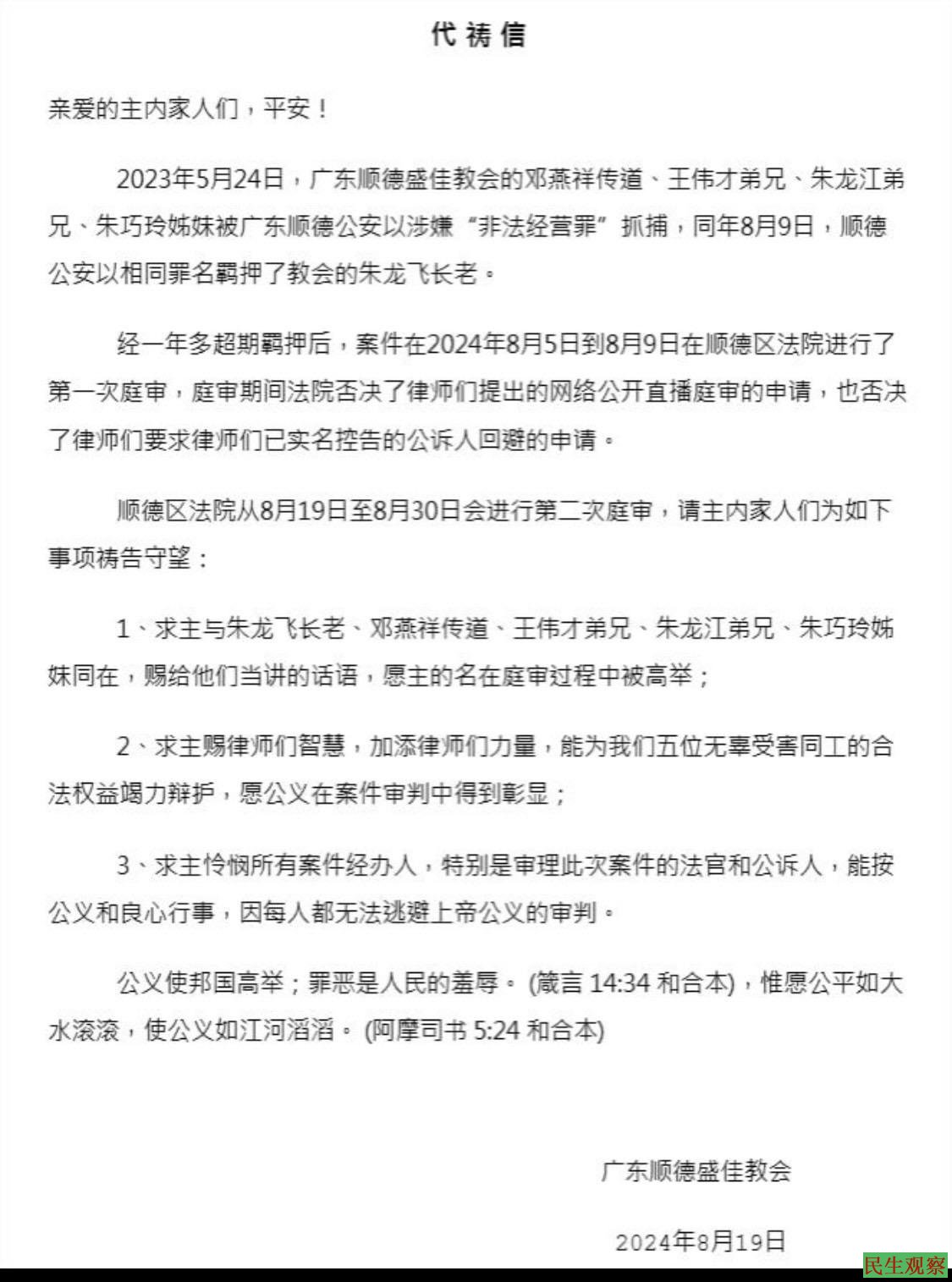 2023年5月24日,广东顺德盛佳教会的邓燕祥传道、王伟才弟兄、朱龙江弟兄、朱巧玲姊妺被广东顺德公安以涉嫌“非法经营罪″抓捕,同年8月9日,顺德公安以相同罪名羁押了教会的朱龙飞长老。