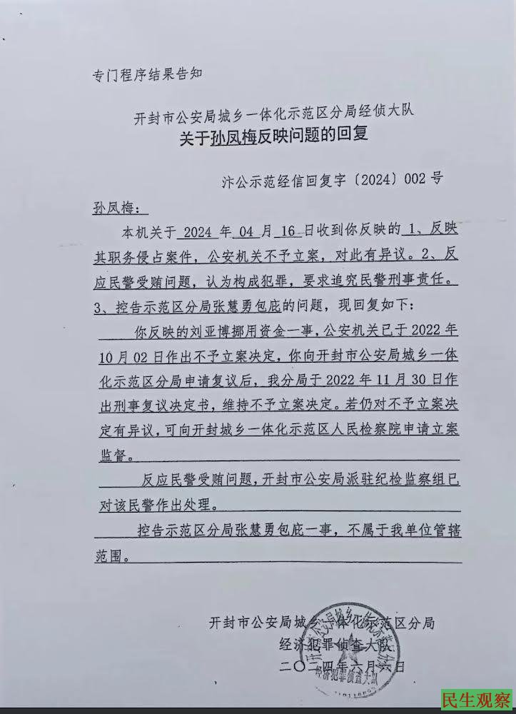 书面答复情况具体如下:对于刘亚博挪用资金一事,公安机关作出不予立案的决定;对于孙凤梅反映的民警受贿一事,开封市公安局派纪检检察组已对该民警作出处理;控告开封市纪委监委人员包庇一事,不属于本单位管辖范围。