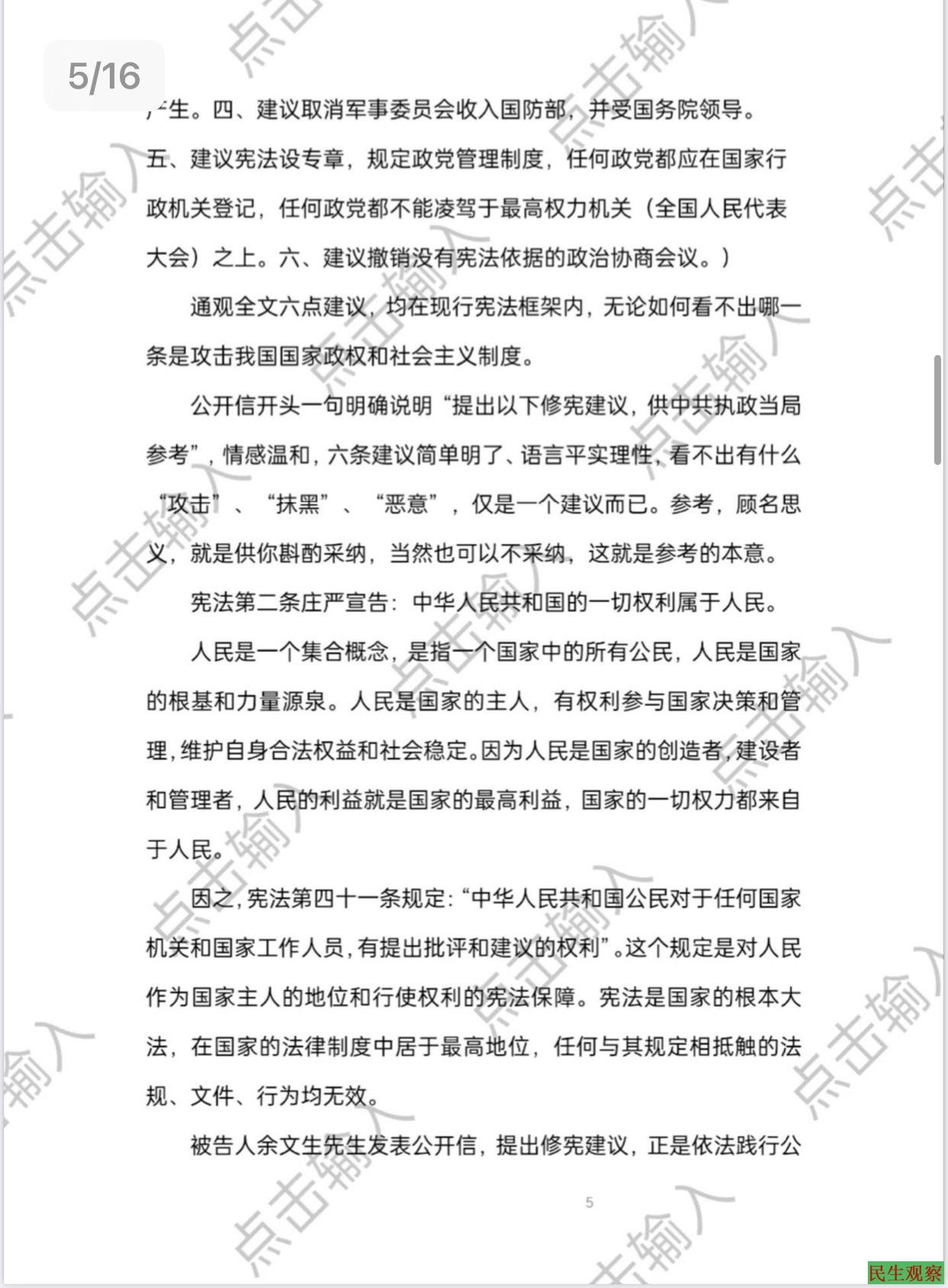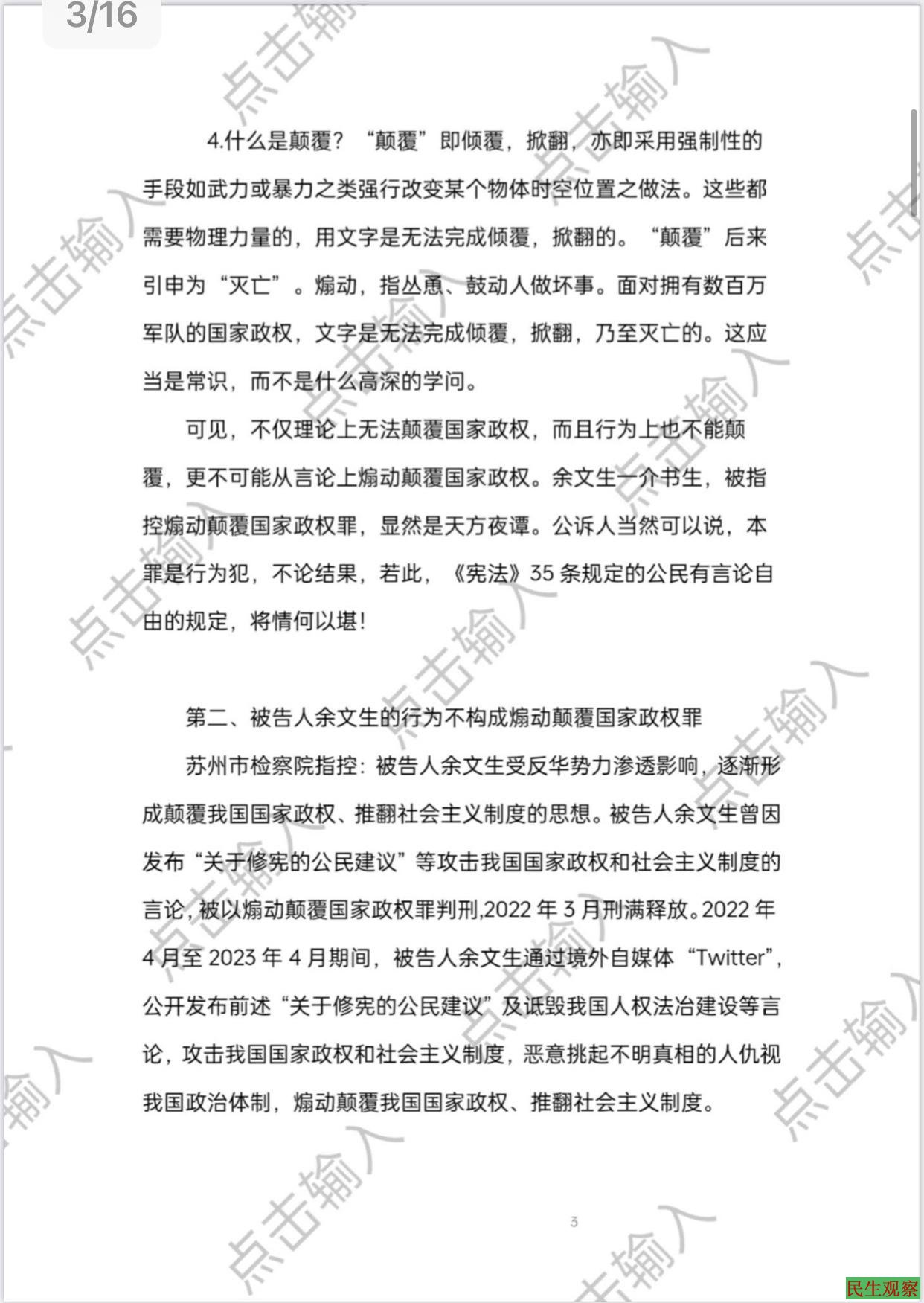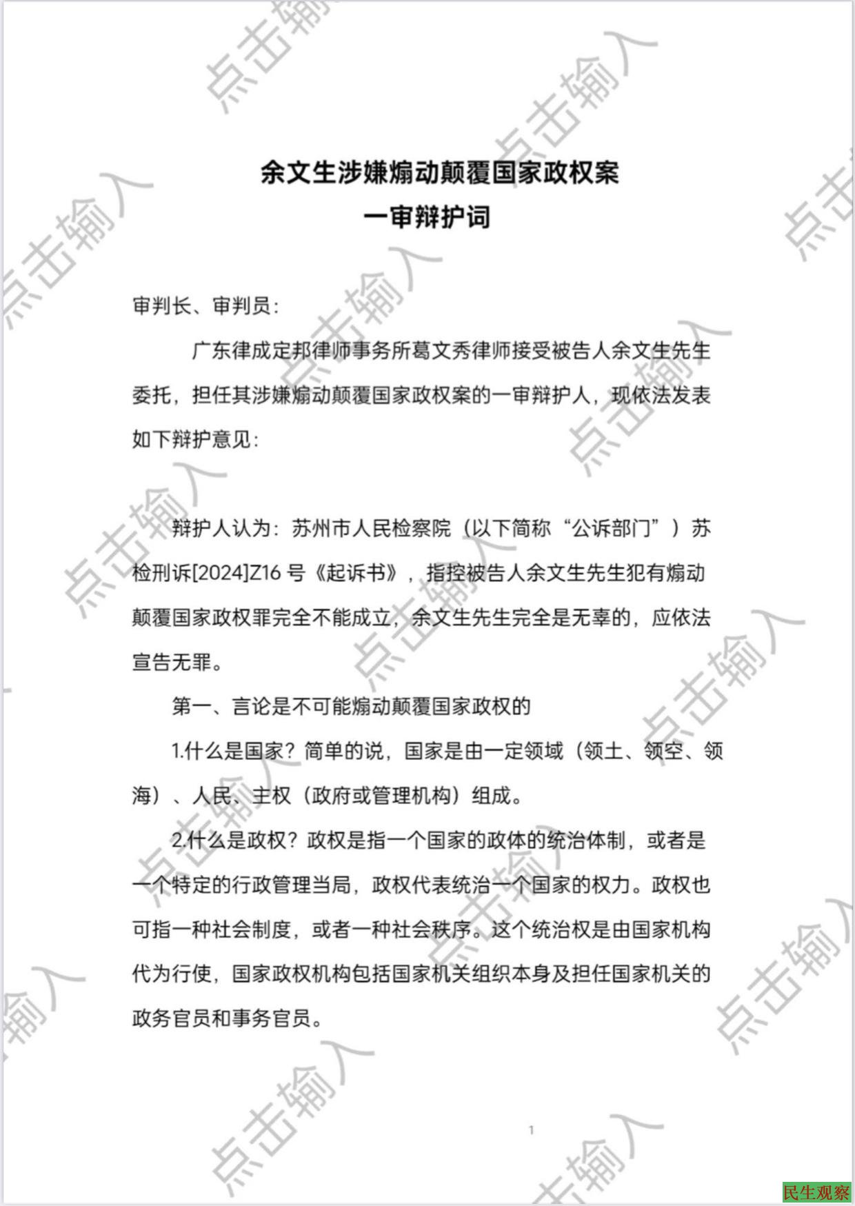 【民生观察2024年8月30日消息】广州律成定邦律师事务所,葛文秀律师认为:苏州市人民检察院,指控被告人余文生先生犯有煽动颠覆国家政权罪完全不能成立,余文生先生是完全无辜的,应依法宣告无罪。