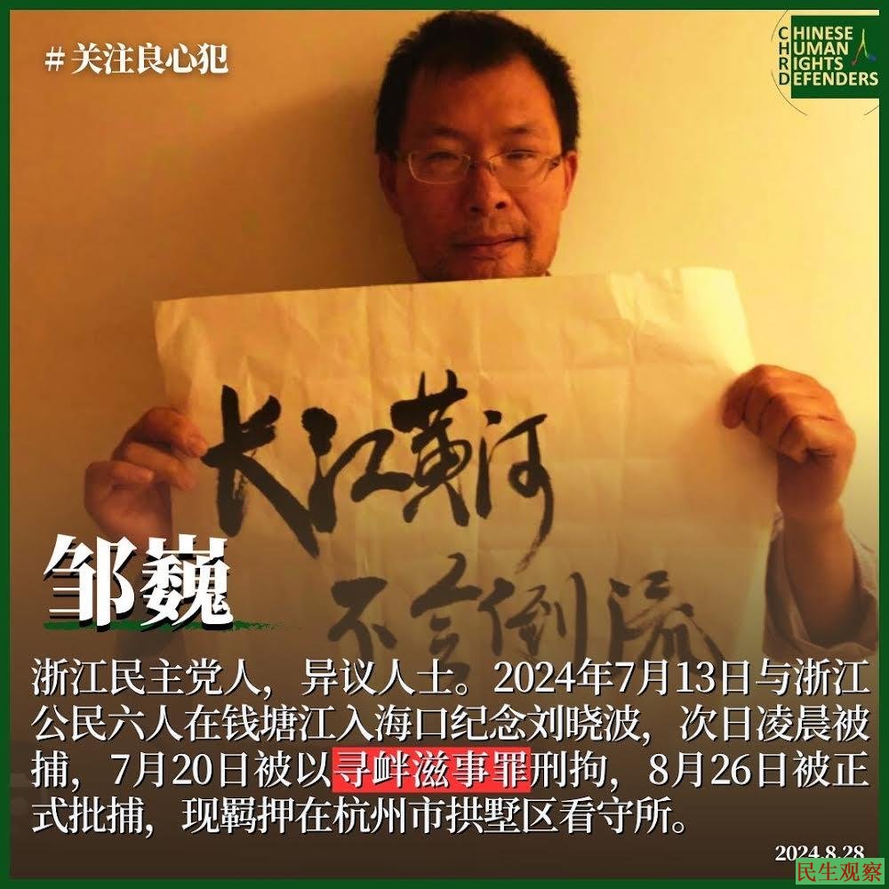 【民生观察2024年8月31日消息】杭州民主党成员昝爱宗、邹巍因为纪念刘晓波上个月被抓捕,目前已经超过37天。近日经多方证实,二人已被杭州市公安局拱墅区分局以涉嫌寻衅滋事罪逮捕。
