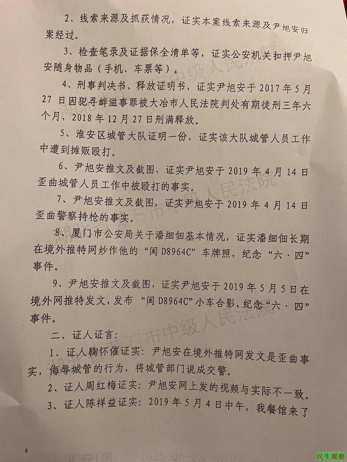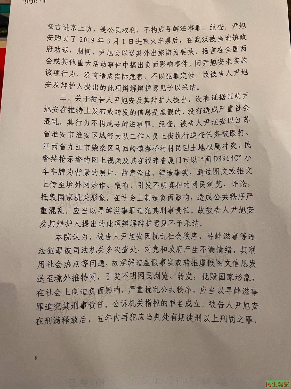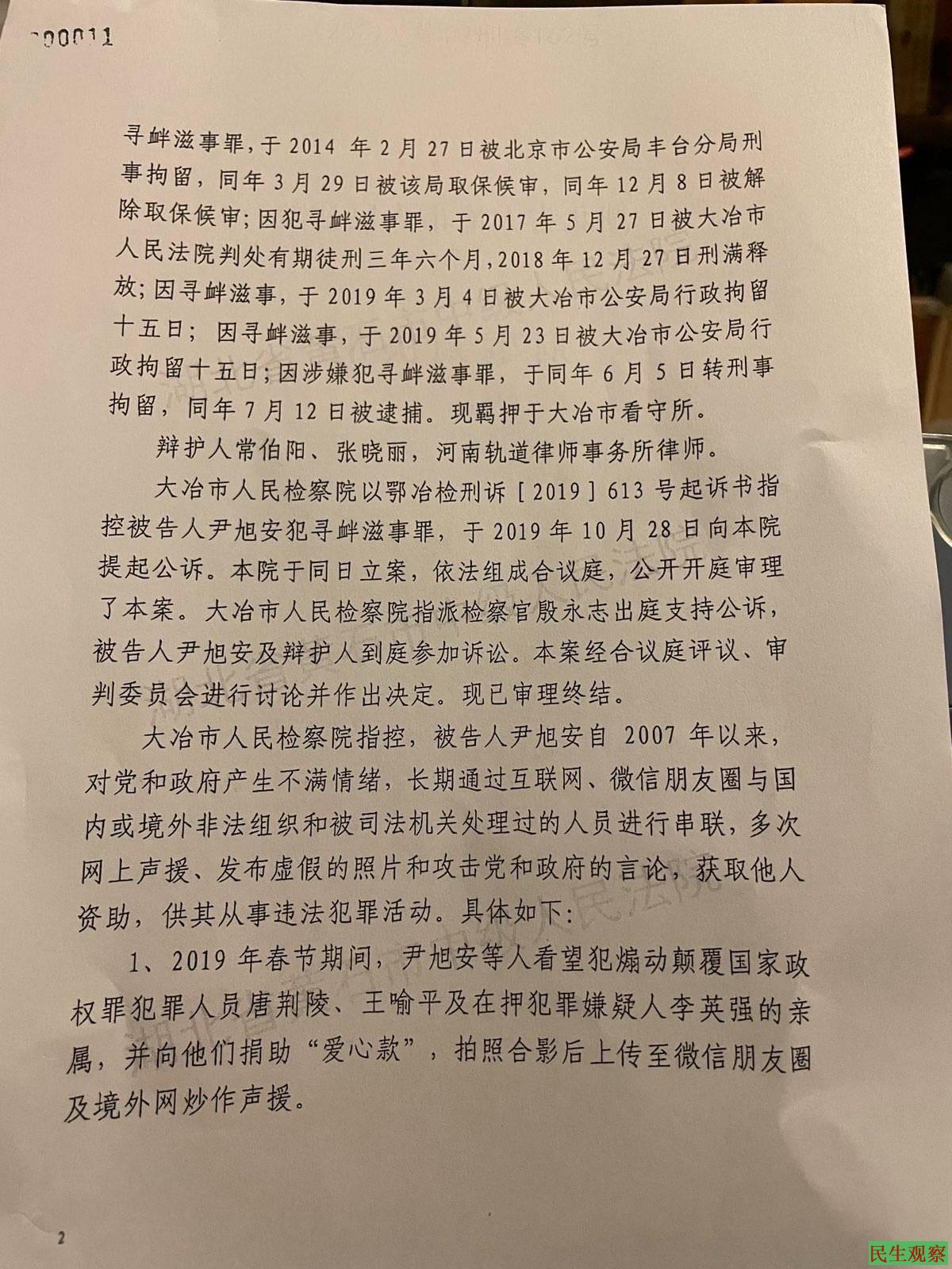 2019年10月,其案被大冶市检察院起诉至地方法院;2020年1月19日,其案被湖北省大冶市法院虽开庭审理,久拖至2021年7月21日终被该法院以“寻衅滋事罪”判处有期徒刑4年6个月,刑期至2023年11月22日;据悉,其在狱中身体状况极差,已被抢救数次。尹旭安案二审2022年1月28日宣判维持原判四年半。此前在黄州监狱服刑。