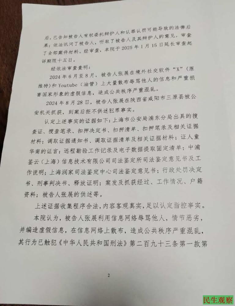 根据起诉书,2024年6-8月张展在推特油管上发表的言论,被指控“利用信息网络辱骂他人”,“编造虚假信息,在信息网络上散布,造成公共秩序严重混乱”。